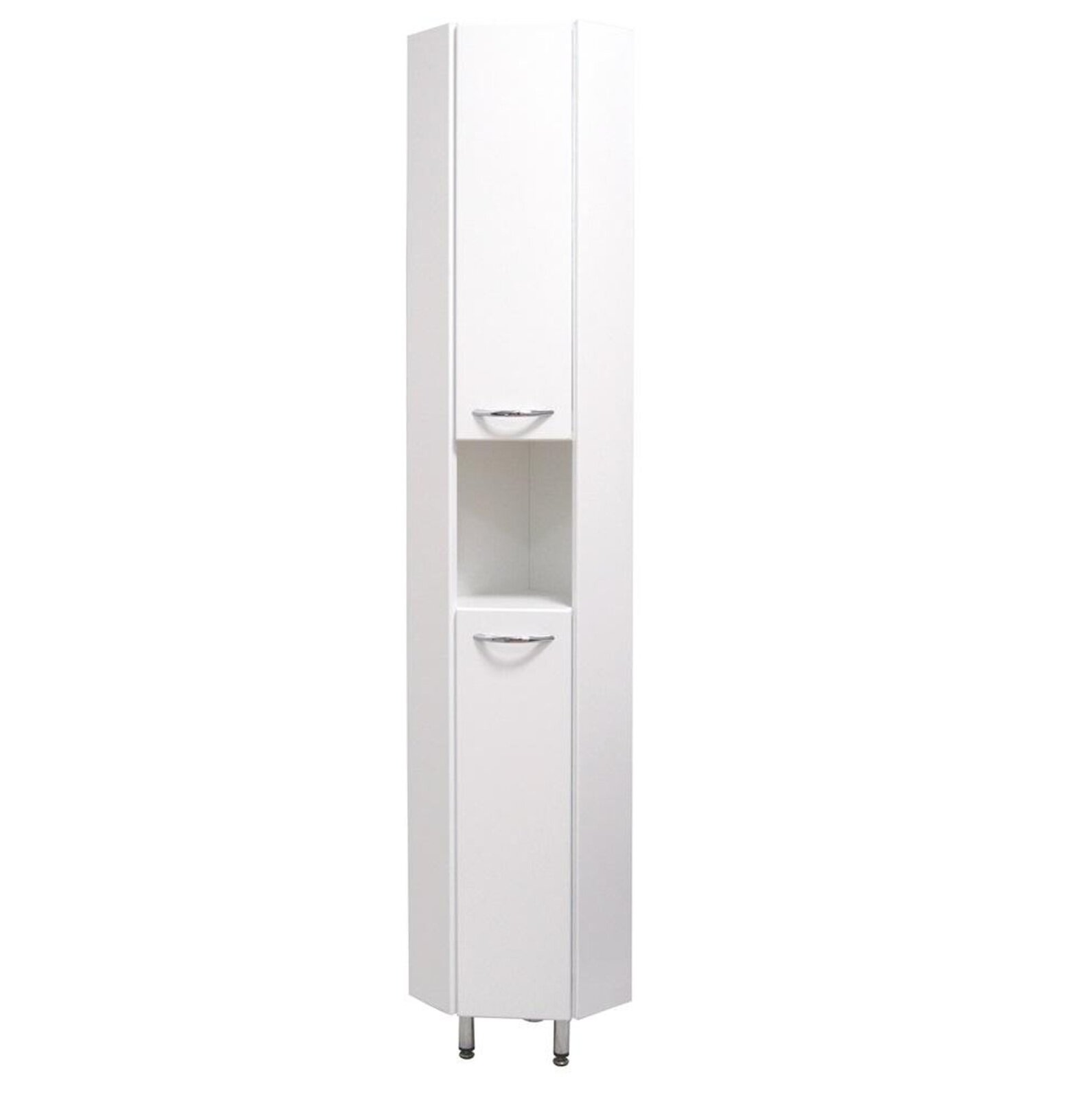 Белая глянцевая поверхность, простые узкие ручки и минималистичный дизайн подойдет к любому интерьеру, а открытая полка посередине и два больших отделения за распашными дверями, оснащенными механизмом плавного закрывания - отличное место для хранения необходимых вещей.