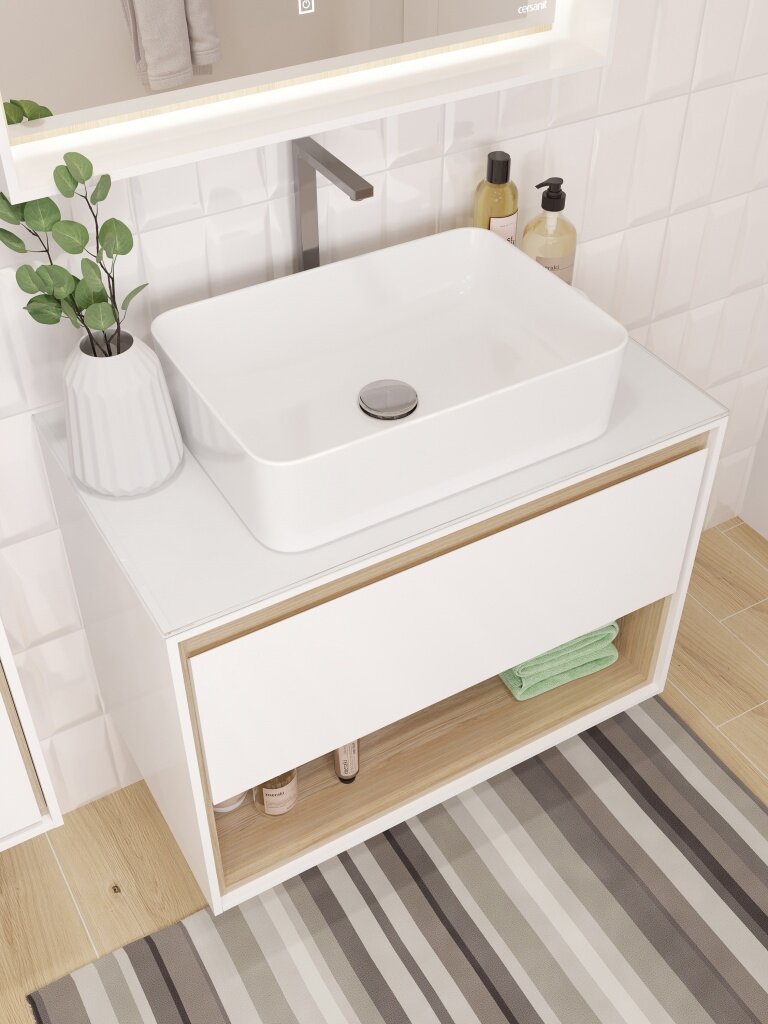 LOUNA – это коллекция, отвечающая последним тенденциям рынка: сочетание чистоты белого цвета и натурального дерева. Основной отличительной особенностью коллекции является её дизайн – сочетание белого с деревом, фрезерованная ручка, выдвижной ящик и удобная открытая полка для хранения. Пенал оборудован стеклянными полками и открытой нишей. Зеркала в коробе ЛДСП оборудованы сенсорной подсветкой.