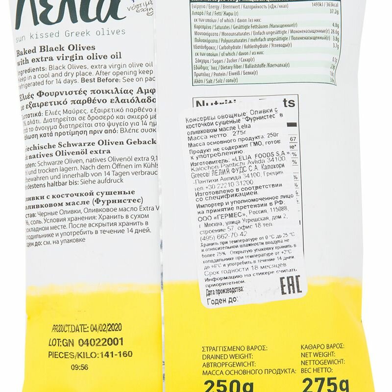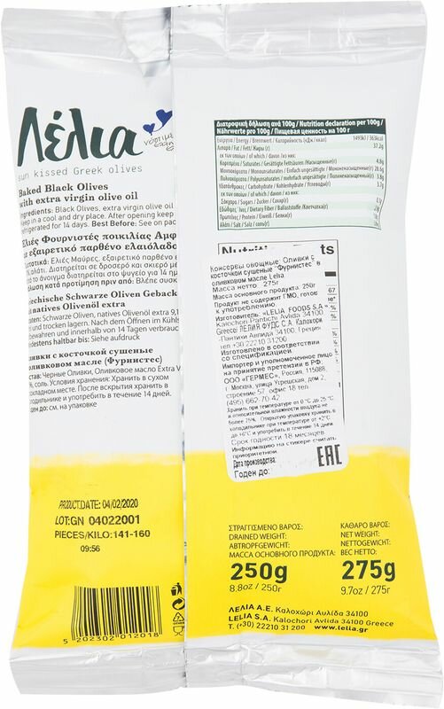 | Состав | Натуральные маслины, оливковое масло Extra Virgin, орегано, соль. |