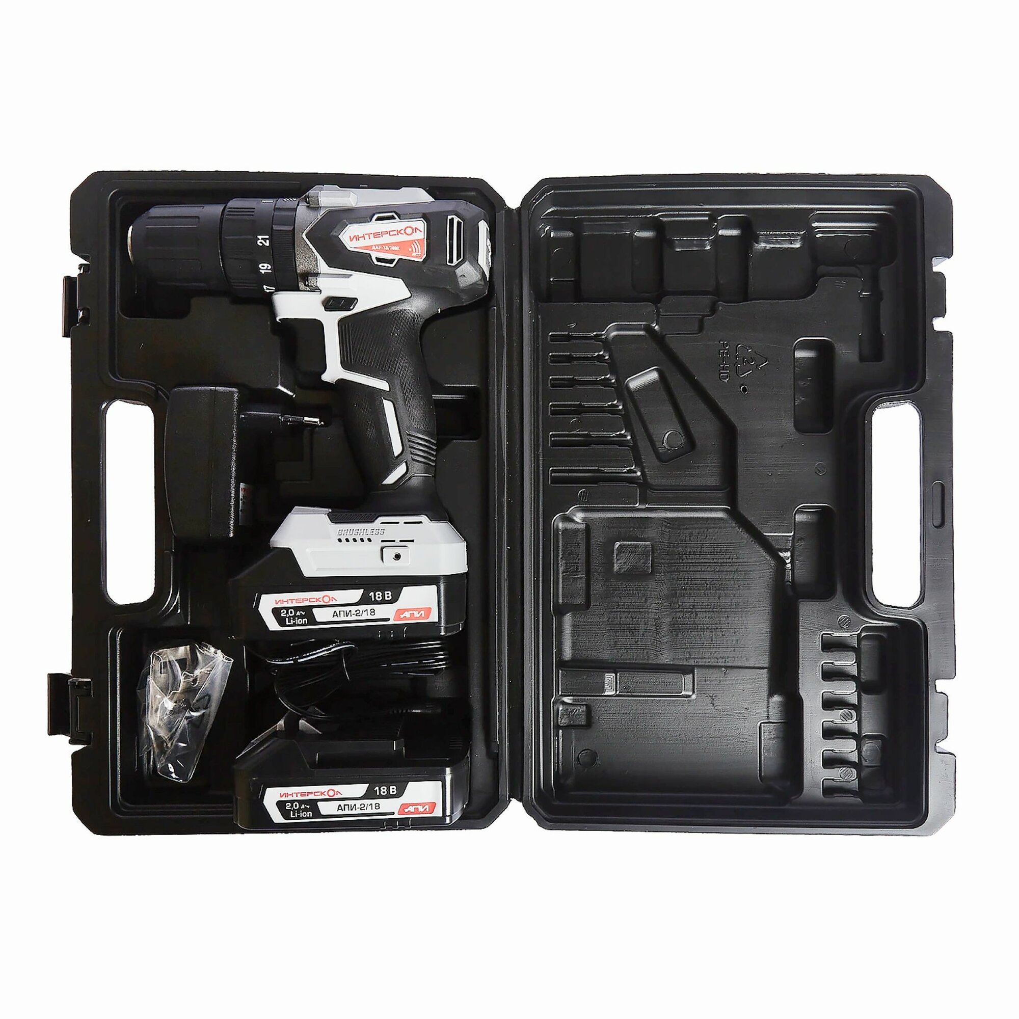 кейс в комплекте - Бесщеточный двигатель и большой момент. Два аккумулятора.