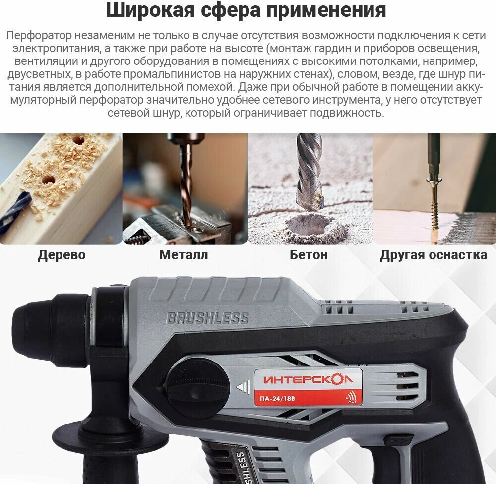 | Прочие особенности и свойства | Незаменим не только в случае отсутствия возможности подключения к сети электропитания, а также при работе на высоте (монтаж гардин и приборов освещения, вентиляции и другого оборудования в помещениях с высокими потолками, например, двусветных, в работе промальпинистов на наружних стенах), словом, везде, где шнур питания является дополнительной помехой, 3 режима работы: сверление с ударом и без, долбление, Возможность поворота долота для удобства работы в режиме "Удар", Бесщеточный двигатель – выше мощность, дольше время работы, компактнее размеры, Патрон SDS-plus для простой смены оснастки, Реверс предусмотрен для легкого извлечения застрявшего бура, Эквивалентная емкость на 30% больше за счет повышенного КПД вентильного двигателя с цифровым управлением, Li-lon аккумулятор: без эффекта памяти, без саморазряда, Кейс решает вопрос хранения и транспортировки Интерскол ПА-24/18В 579.4.1.70 |