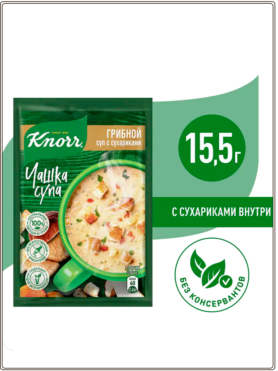 Нет времени на приготовление полноценного обеда? Густой и согревающий крем-суп Knorr быстро утолит голод и позволит насладиться знакомым с детства насыщенным вкусом куриного бульона в сопровождении хрустящих пшеничных сухариков.