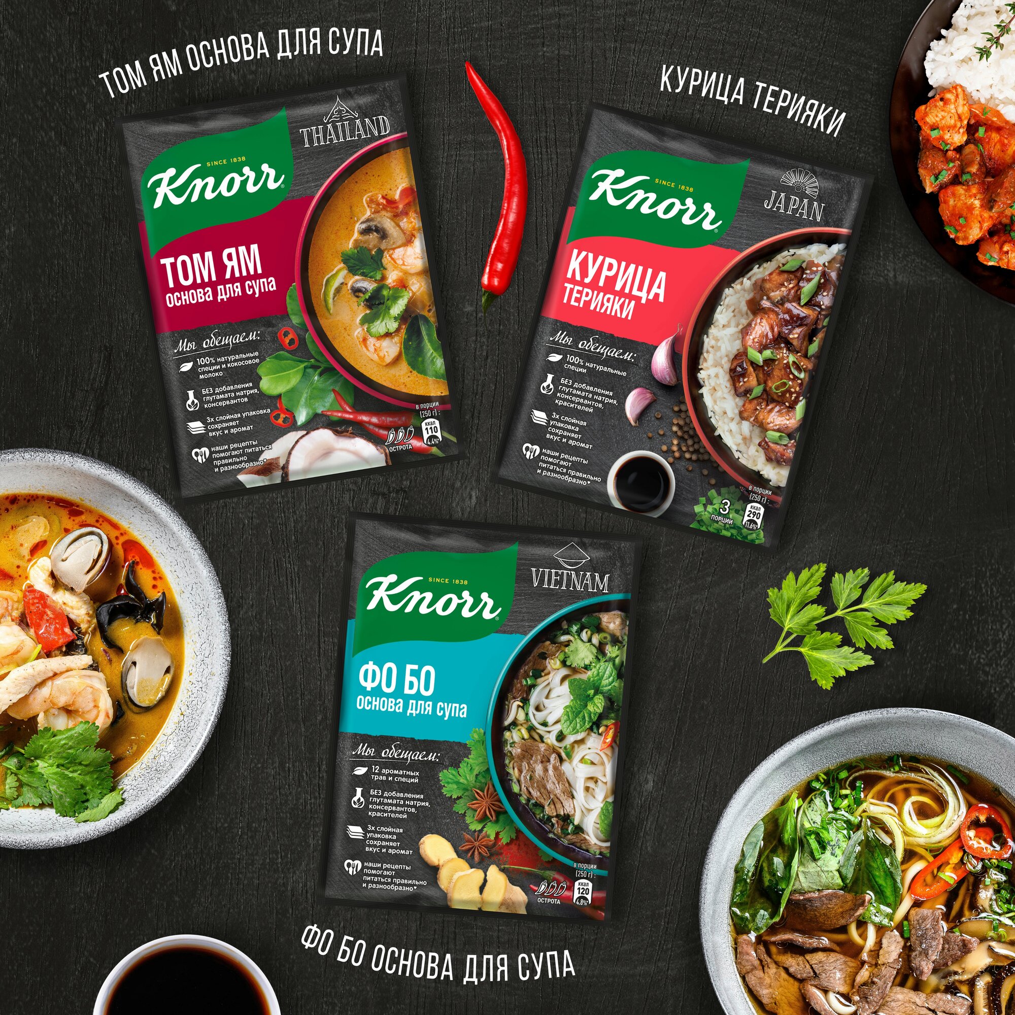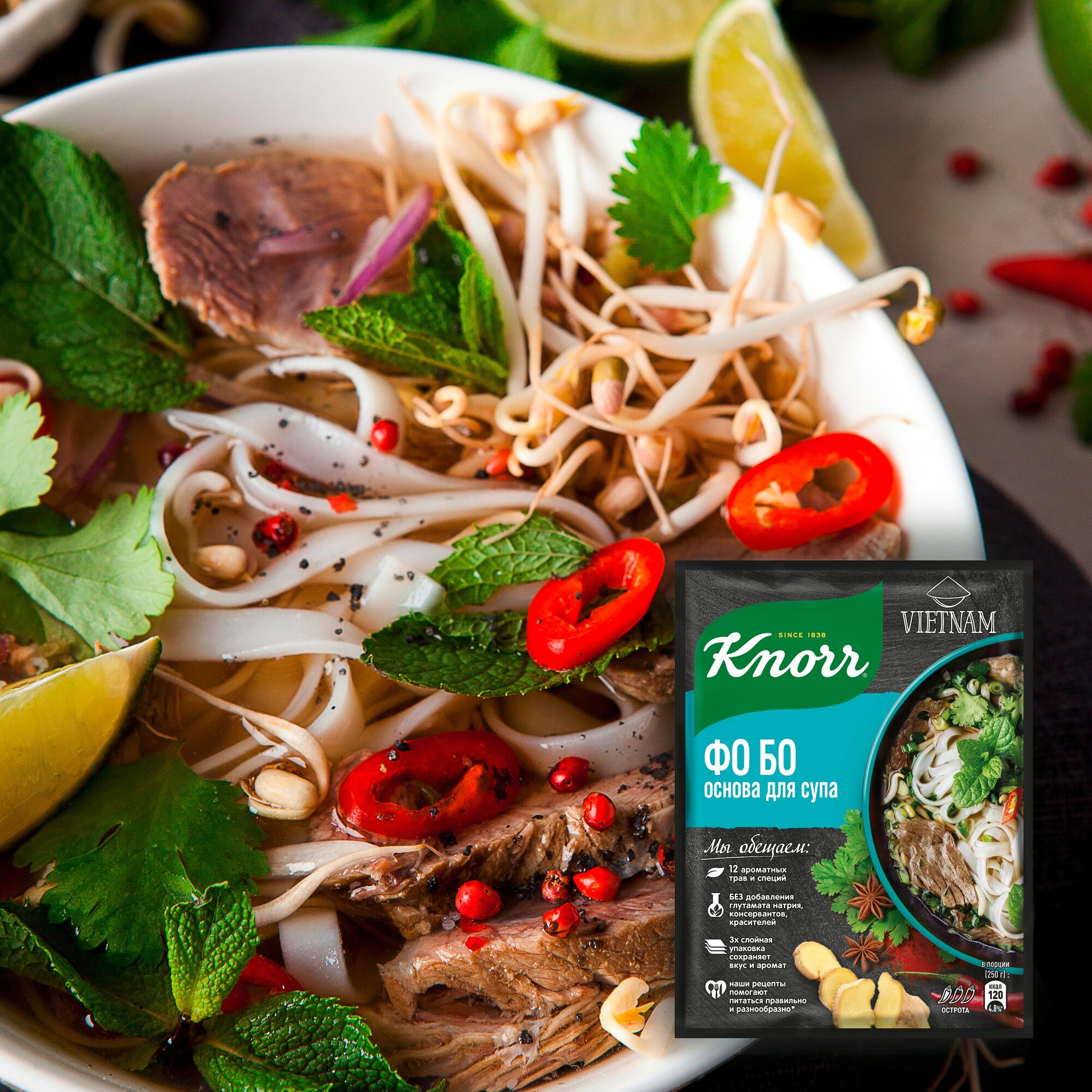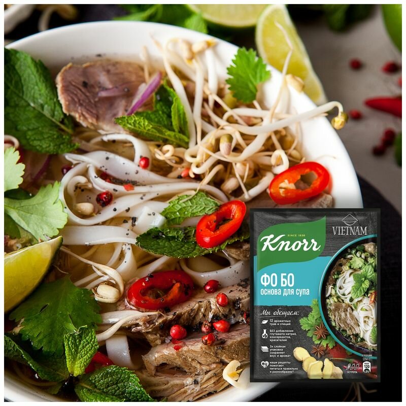 Основа Knorr для приготовления вьетнамского супа Фо Бо. Сухая однородная смесь мелкого помола из имбиря, чеснока, листьев каффира, перца чили, кинзы, томатов, лука и сухого кокосового молока. Достаточно насыпать в 1 литр холодной воды и варить на слабом огне 4 минуты с добавлением рисовой лапши и вареной говядины. В трехслойной непрозрачной упаковке — сохраняет вкус и аромат содержимого.