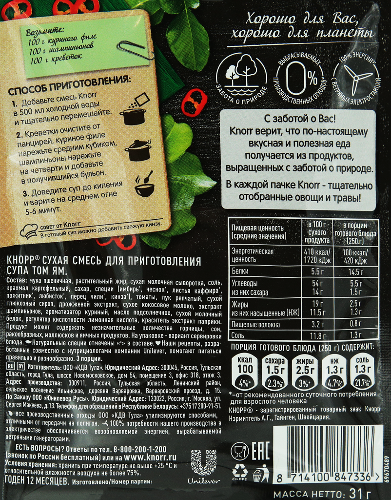 Национальное блюдо Таиланда суп Том Ям (кисло-острый суп на основе куриного бульона с добавлением морепродуктов) так известен и любим во всем мире, что у него даже есть собственные фан-клубы. Его часто называют самым острым супом азиатской кухни. Благодаря основе для супа от Knorr Том Ям можно быстро и без усилий приготовить дома, несмотря на его экзотичность. Время приготовления займет не больше 15 минут. Основа для супа Том Ям от Knorr – это сухая однородная смесь мелкого помола. При ее изготовлении использованы 100% натуральные овощи и специи, среди которых имбирь, чеснок, листья каффира, перец чили, кинза и томаты. Лучшего вкуса можно добиться только с помощью первоклассных ингредиентов. Мы прикладываем максимум усилий, чтобы отбирать только сочные и ароматные овощи. Тысячи ферм по всему миру, где с любовью выращиваются овощи и зелень специально для Knorr, дают нам только лучшее. Основа для супа Том Ям заключена в трехслойную непрозрачную упаковку, которая отлично сохраняет вкус и аромат содержимого. Упаковка создана с заботой о природе из экологичных, перерабатываемых материалов. В приправе нет консервантов, красителей и усилителей вкуса. Основа для супа Knorr Том Ям – хороший помощник в быстром приготовлении вкусного обеда или ужина. Ароматное и натуральное блюдо с первой ложки покорит своим необычным вкусом. Благодаря кулинарным экспериментам с использованием другого сорта мяса, морепродуктов, овощей и риса, оно порадует новыми вкусовыми ощущениями и позволит добиться идеального результата.
