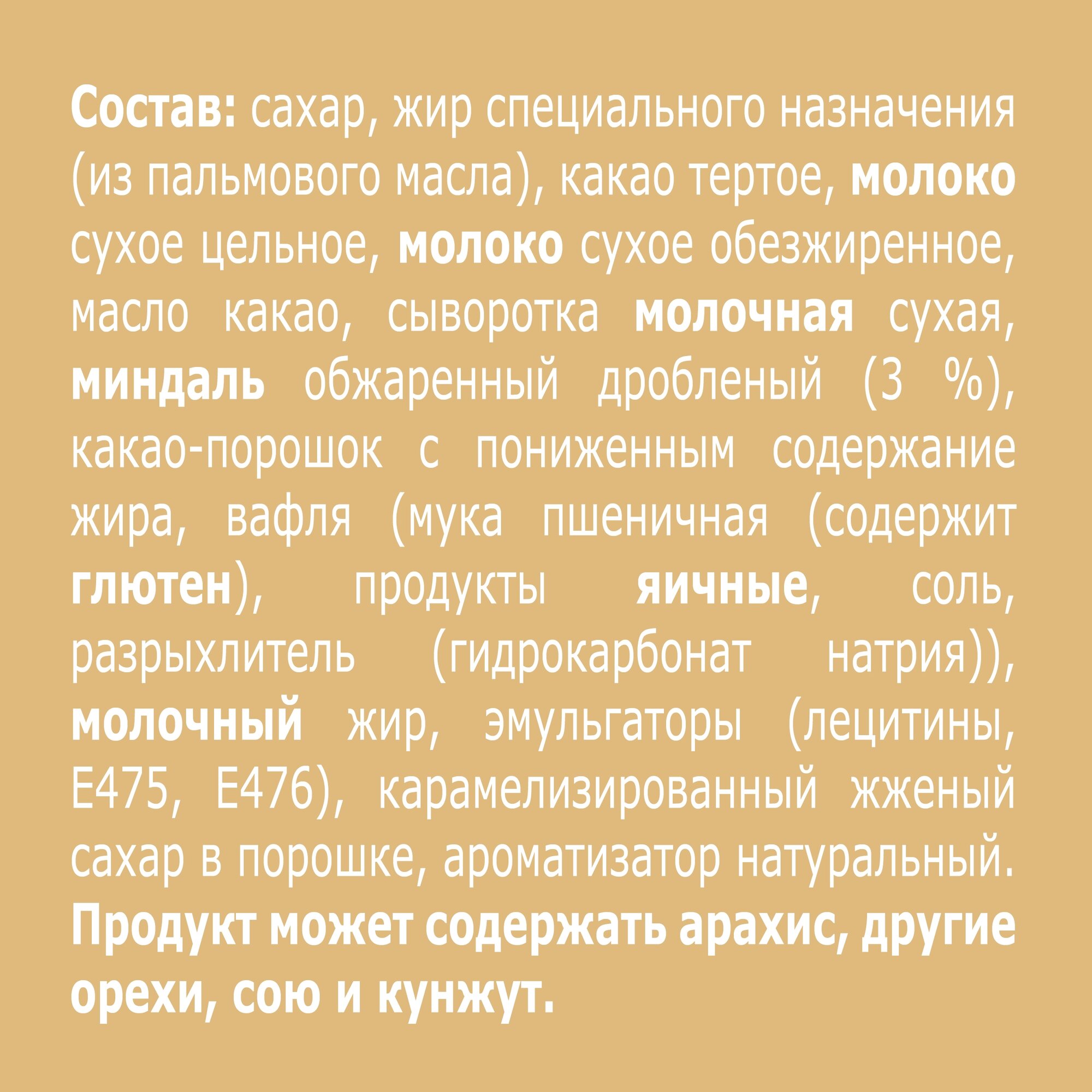 | Состав | сахар, жир специального назначения (из пальмового масла), какао тертое, молоко сухое цельное, молоко сухое обезжиренное, масло какао, сыворотка молочная сухая, миндаль обжаренный дробленый (3 %), какао-порошок с пониженным содержанием жира, вафля (мука пшеничная (содержит глютен), продукты яичные, соль, разрыхлитель (гидрокарбонат натрия)), молочный жир, эмульгаторы (лецитины, Е475, Е476), карамелизированный жженый сахар в порошке, ароматизатор натуральный.Продукт содержит крем-карамель - 34,9 %. Продукт может содержать сою, арахис, другие орехи, кунжут. |