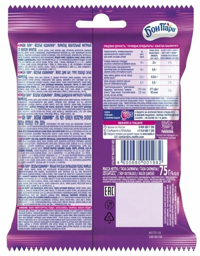 | Состав | Патока, сахар, желатин, вода, регулятор кислотности (лимонная кислота), концентрированный яблочный сок, агент желирующий (пектины) (0.46%), краситель (антоцианы (получен из моркови)), натуральные ароматизаторы (черная смородина, яблоко, клубника, малина), масло пальмовое, глазирователь (воск карнаубский), комплексная пищевая добавка (глюкозный сироп, носитель (глицерин), краситель (уголь растительный)) |