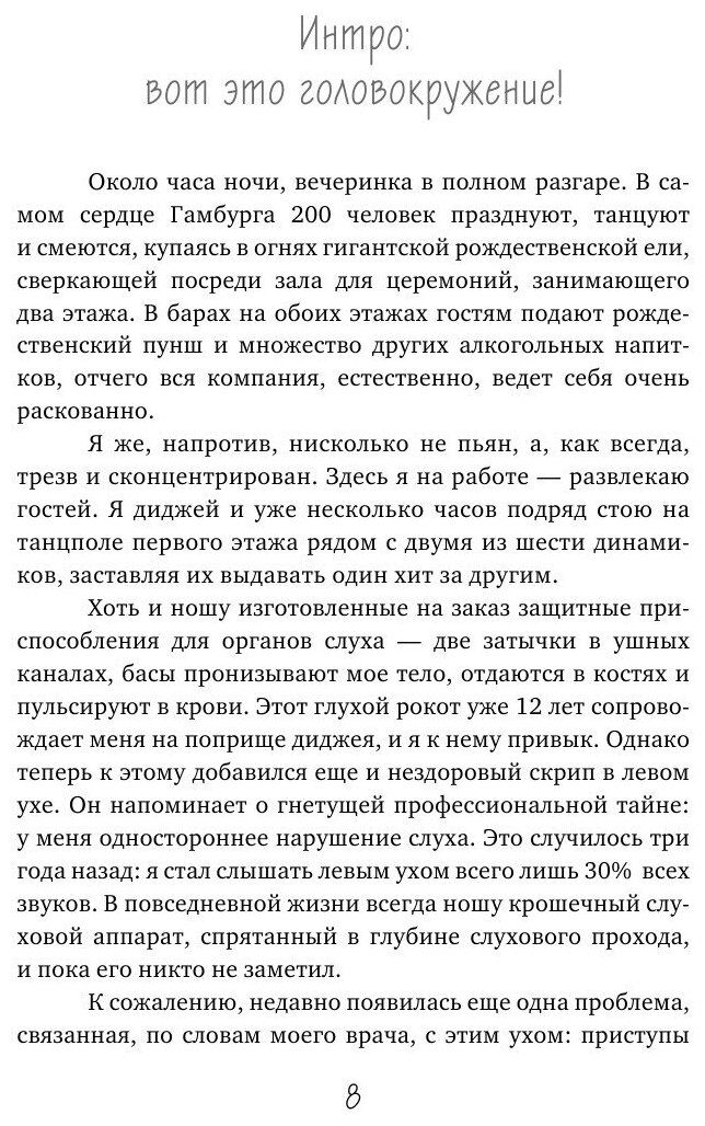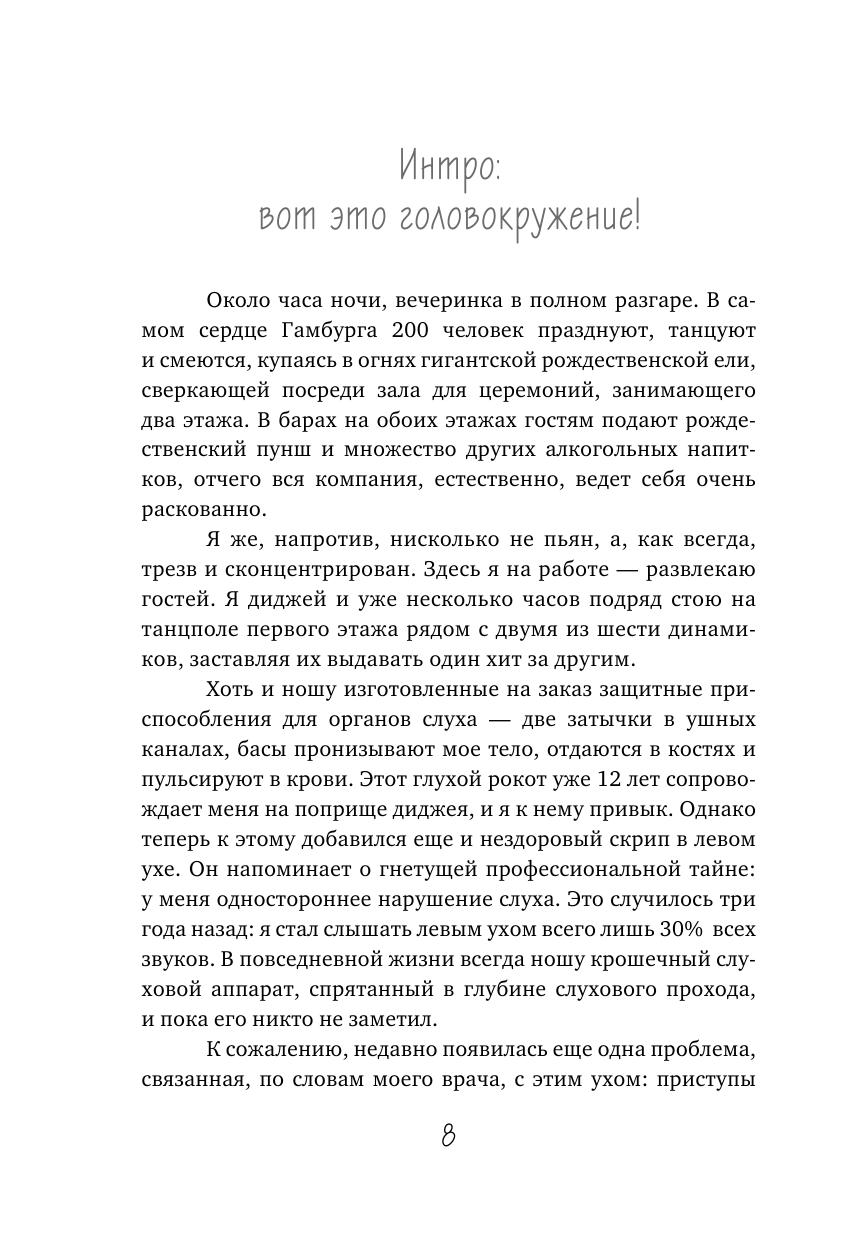 Томас Зюндер, автор этой книги, провел более 500 свадеб, он диджей. Все 12 лет он обожал свою работу — до тех пор, пока постепенная потеря слуха не стала серьезно сказываться на общем самочувствии: у него начались сильные приступы головокружений прямо на рабочем месте, в самый разгар вечеринок. Поняв, что карьера окончена, Томас направил все силы на изучение небольшого, но такого важного для каждого человека органа, как ухо.