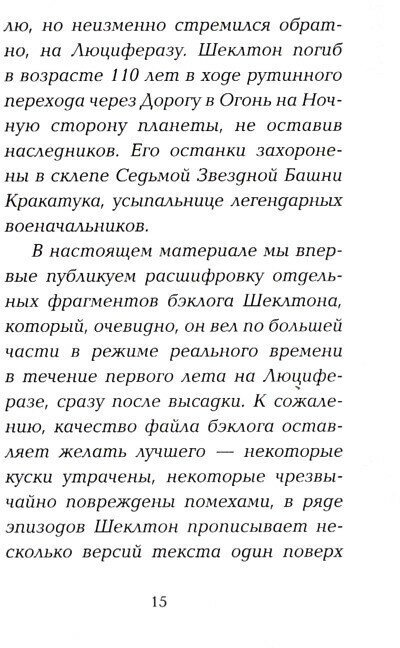 "Меня зовут капитан Азриэль Шеклтон, и это мой корабль" - такими словами начинается рассказ о поисках новой планеты Люциферазы, на которую возложены большие надежды. Но никто из членов трёх экипажей не знает, оправдаются ли они.