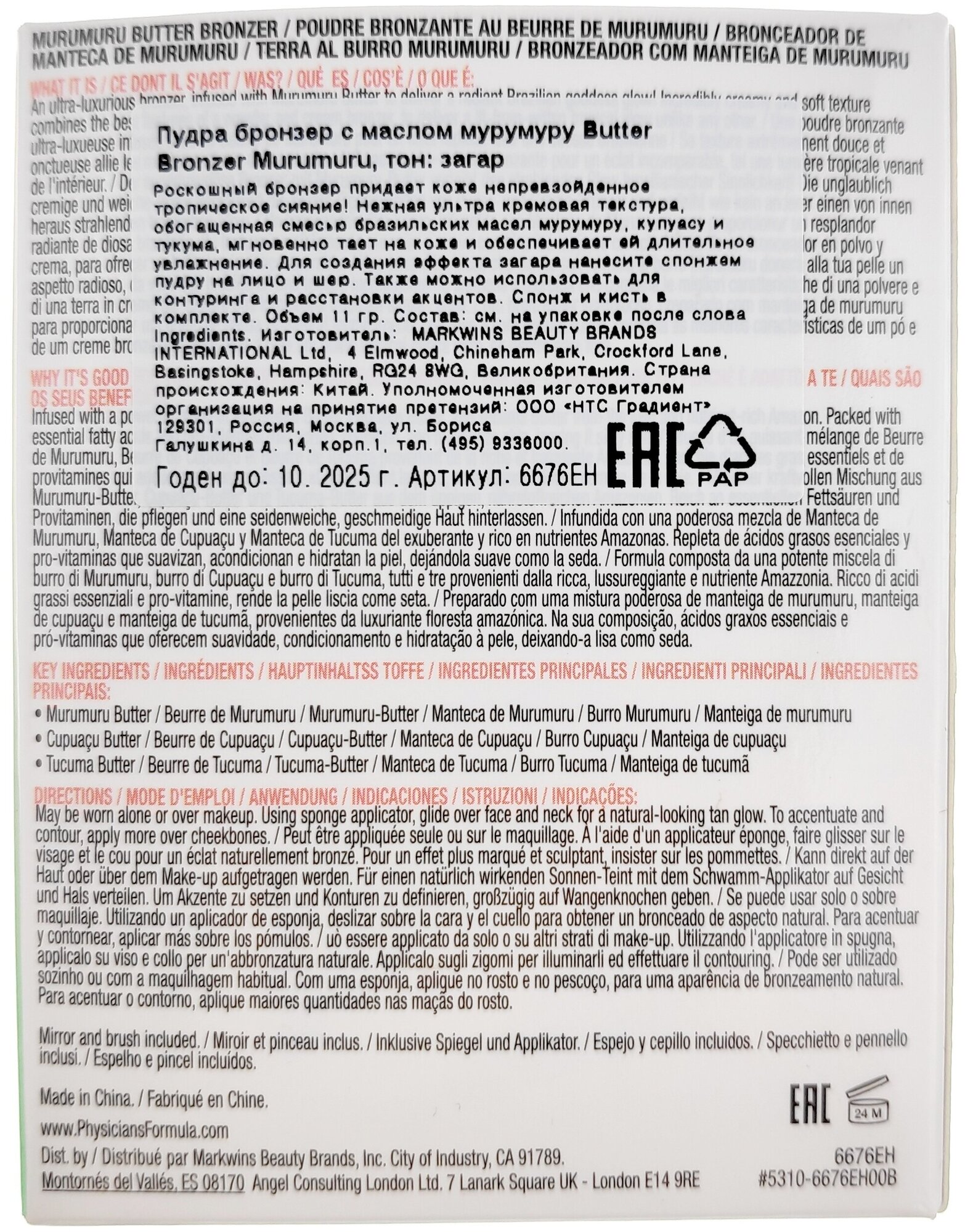 Пудра Physicians Formula (Физишн формула) бронзер с маслом мурумуру Butter Bronzer Murumuru тон: загар Markwins Beauty Brands IT (1135299)