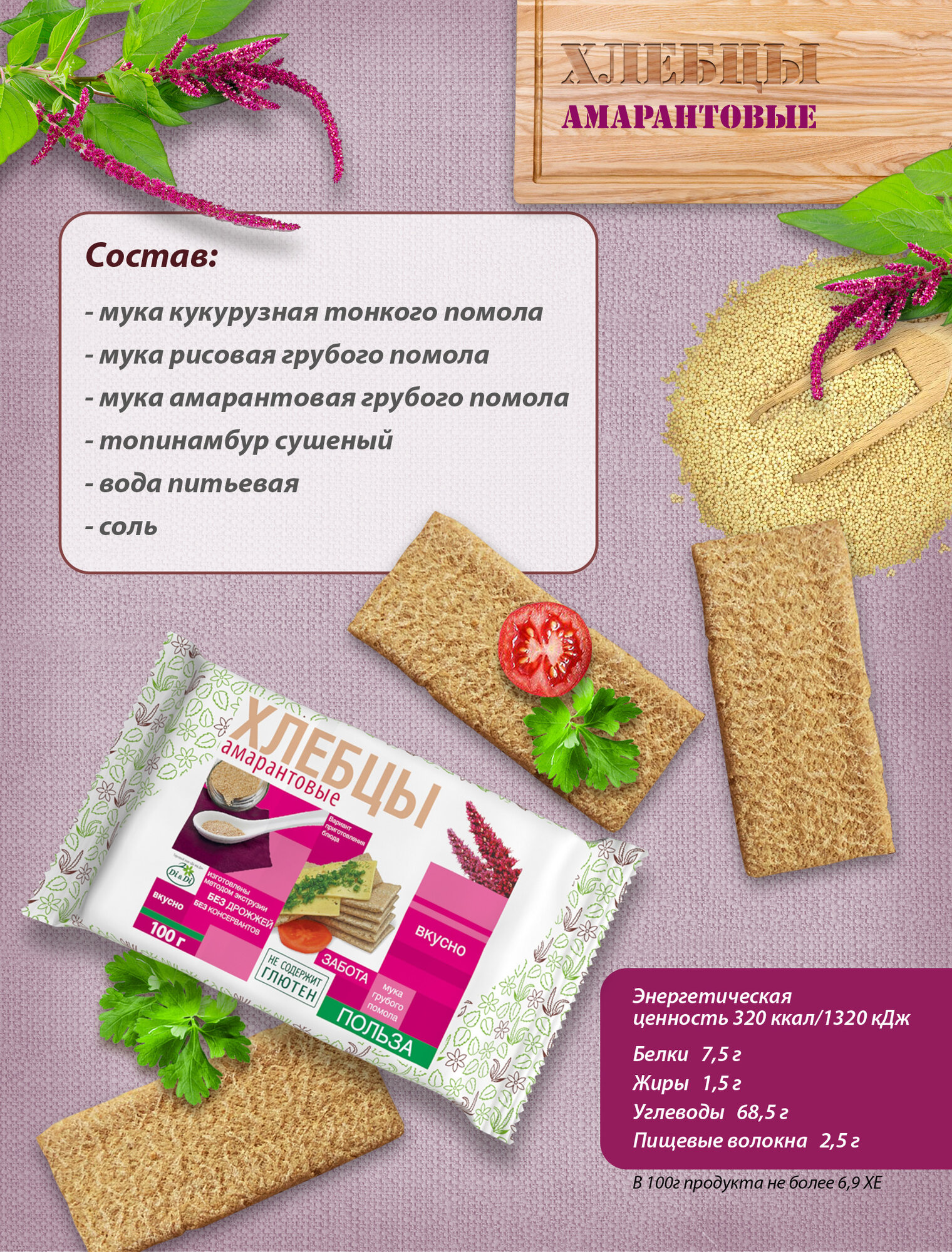 Состав: топинамбур, мука амарантовая, мука рисовая цельнозерновая, мука кукурузная, соль