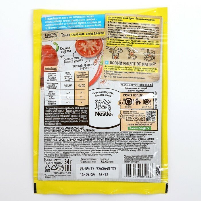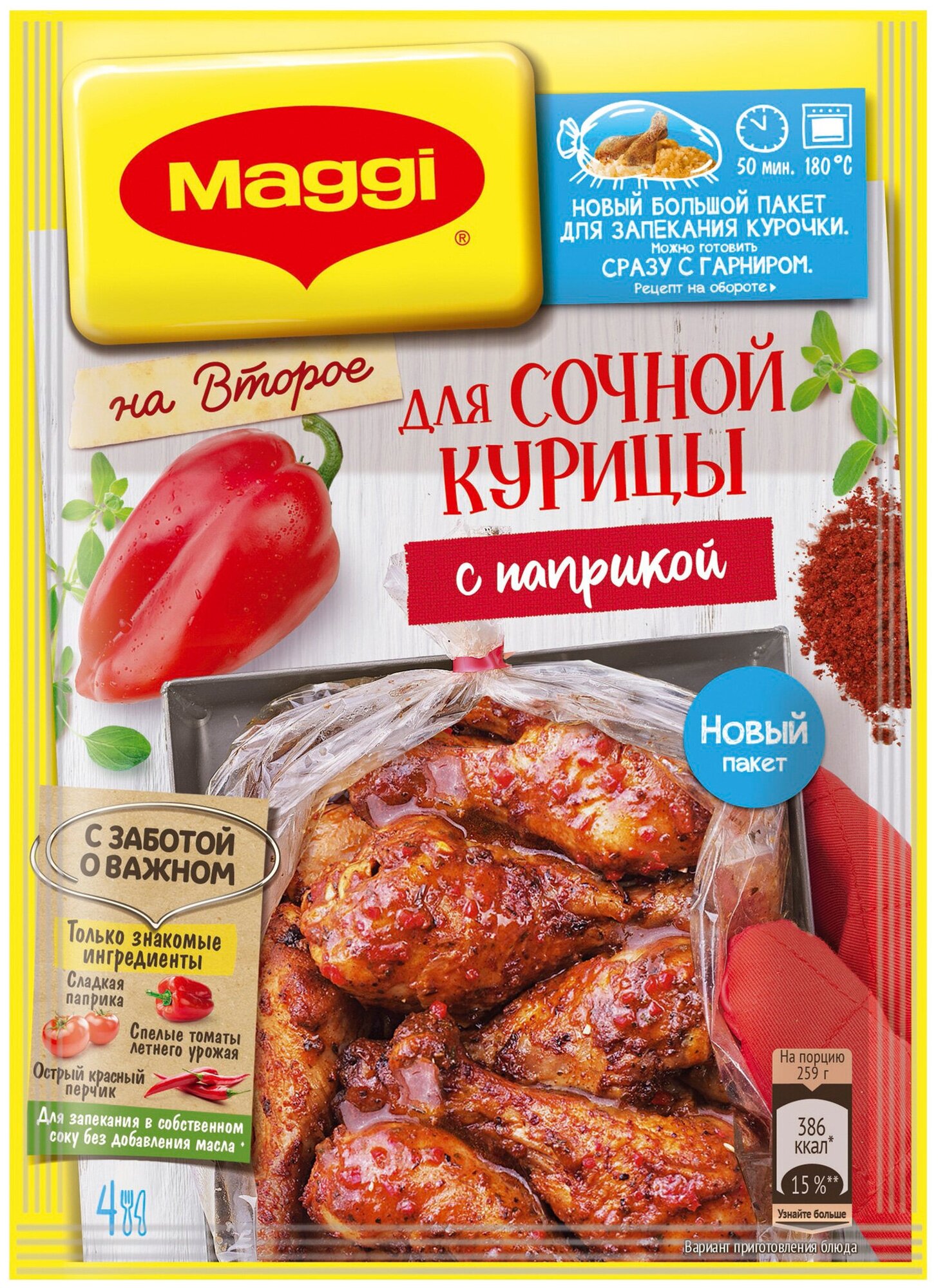 MAGGI На второе для Сочной Курицы с Паприкой поможет легко и быстро приготовить любимое блюдо для всей семьи! Запеченные в специальном пакете без дополнительного добавления масла куриные ножки получаются необычайно сочными и вкусными, а умело-подобранная композиция из овощей, душистых трав и пряных специй поможет раскрыть вкус и аромат вашего блюда. В новом большом пакете для запекания вы можете готовить любимую сочную курочку сразу с гарниром - свежими овощами по сезону или крупами, и каждый раз за 50 минут создавать сбалансированное и вкусное блюдо.