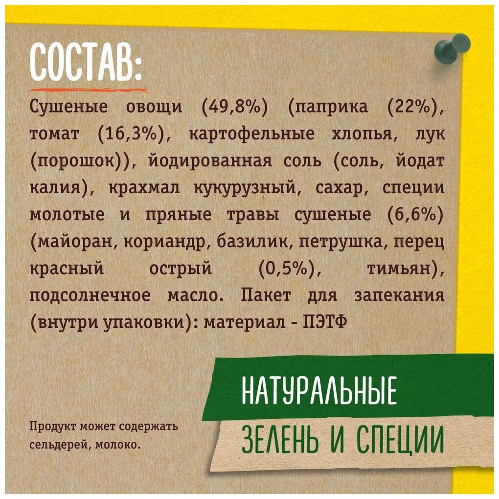 | Состав | Сушеные овощи (паприка, томаты, картофельные хлопья, лук репчатый), йодированная соль (соль, йодат калия), крахмал кукурузный, сахар, специи молотые и зелень сушеная (кориандр, майоран, базилик, петрушка, перец красный острый, тимьян), пшеничная мука (содержит глютен), подсолнечное масло. Продукт может содержать молоко, сельдерей. |