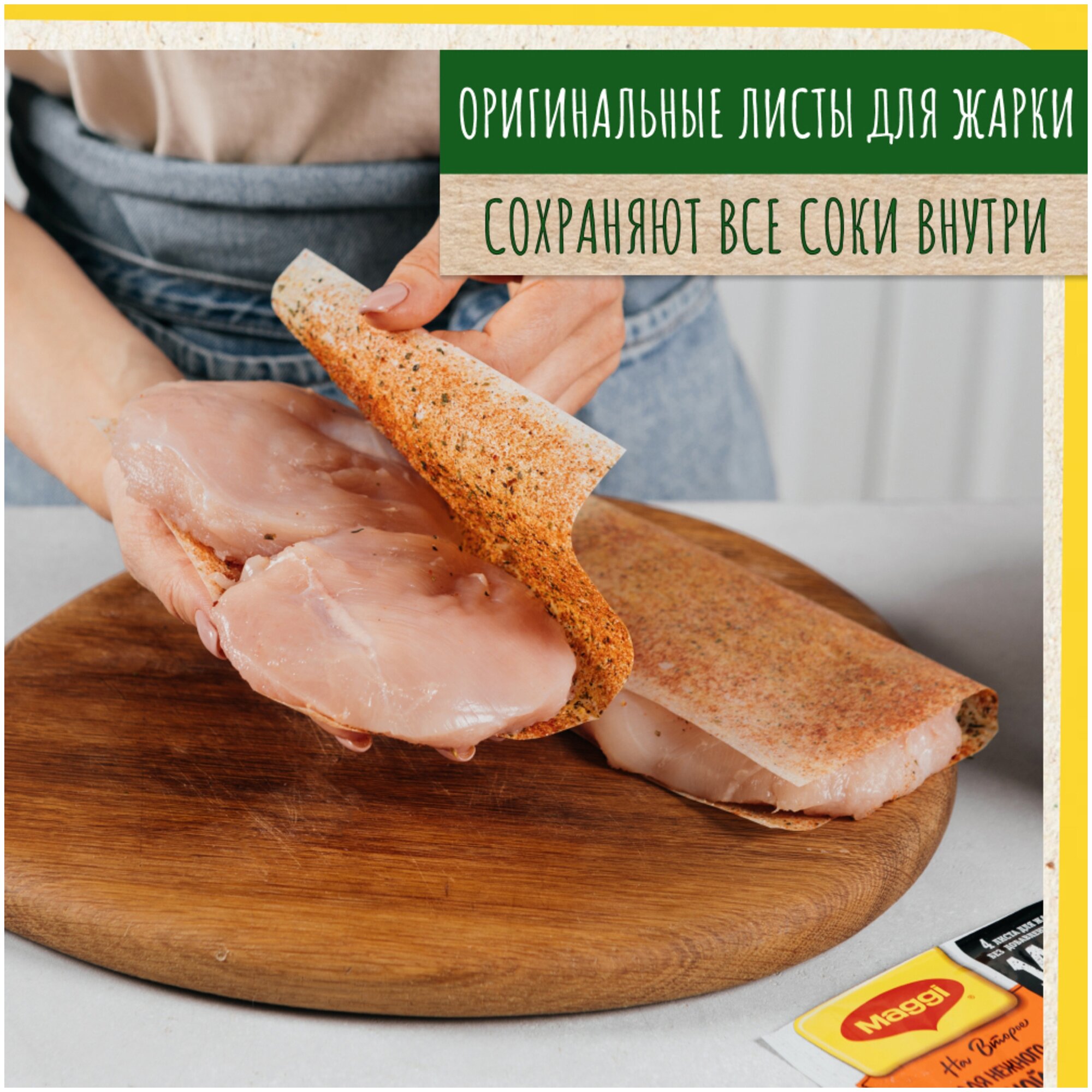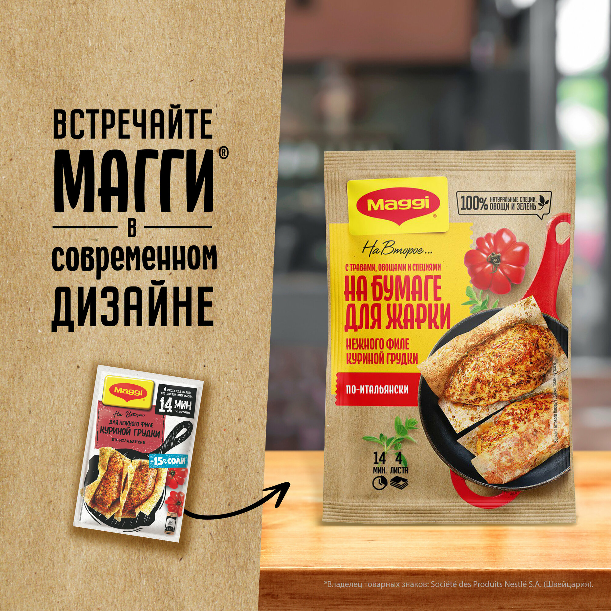 Как приготовить нежное и сочное куриное филе без масла всего за 14 минут? Очень легко с новыми листами для жарки MAGGI® На второе. Это простой способ сделать вкусное ресторанное блюдо у себя дома и побаловать близких рецептом грудки по-итальянски, не тратя много времени у плиты. Листы для жарки от MAGGI® запечатывает все соки мяса внутри и наполняет его ароматом душистых трав. А травы делает курочку удивительно нежной и аппетитной! В одной упаковке MAGGI® На второе 4 листа со слоем специй и сушеных овощей. В состав входят томаты, лук, чеснок, паприка, а также приправы и пряности — петрушка, базилик, орегано, чабер, соль, перец и карри.