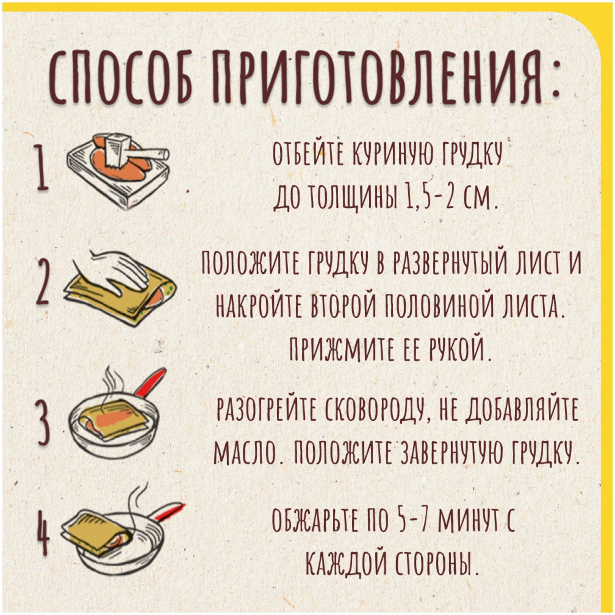 | Способ приготовления | Для приготовления Вам потребуется: куриная грудка – 4 шт. (600 г) 1. Куриные грудки отбейте до толщины 1,5 – 2 см. 2. Разверните лист для жарки и положите на его половину одну куриную грудку. Накройте второй половиной листа. Завёрнутую грудку прижмите рукой. 3. Без добавления масла разогрейте сковороду и положите на нее завернутую грудку. 4. Готовьте на слабом огне на газовой плите или на средней мощности на электрической плите в течение 5-7 минут с каждой стороны. Если специи начинают подгорать, уменьшите огонь и жарьте до готовности. |