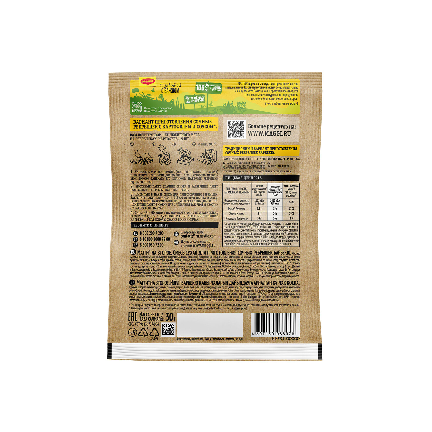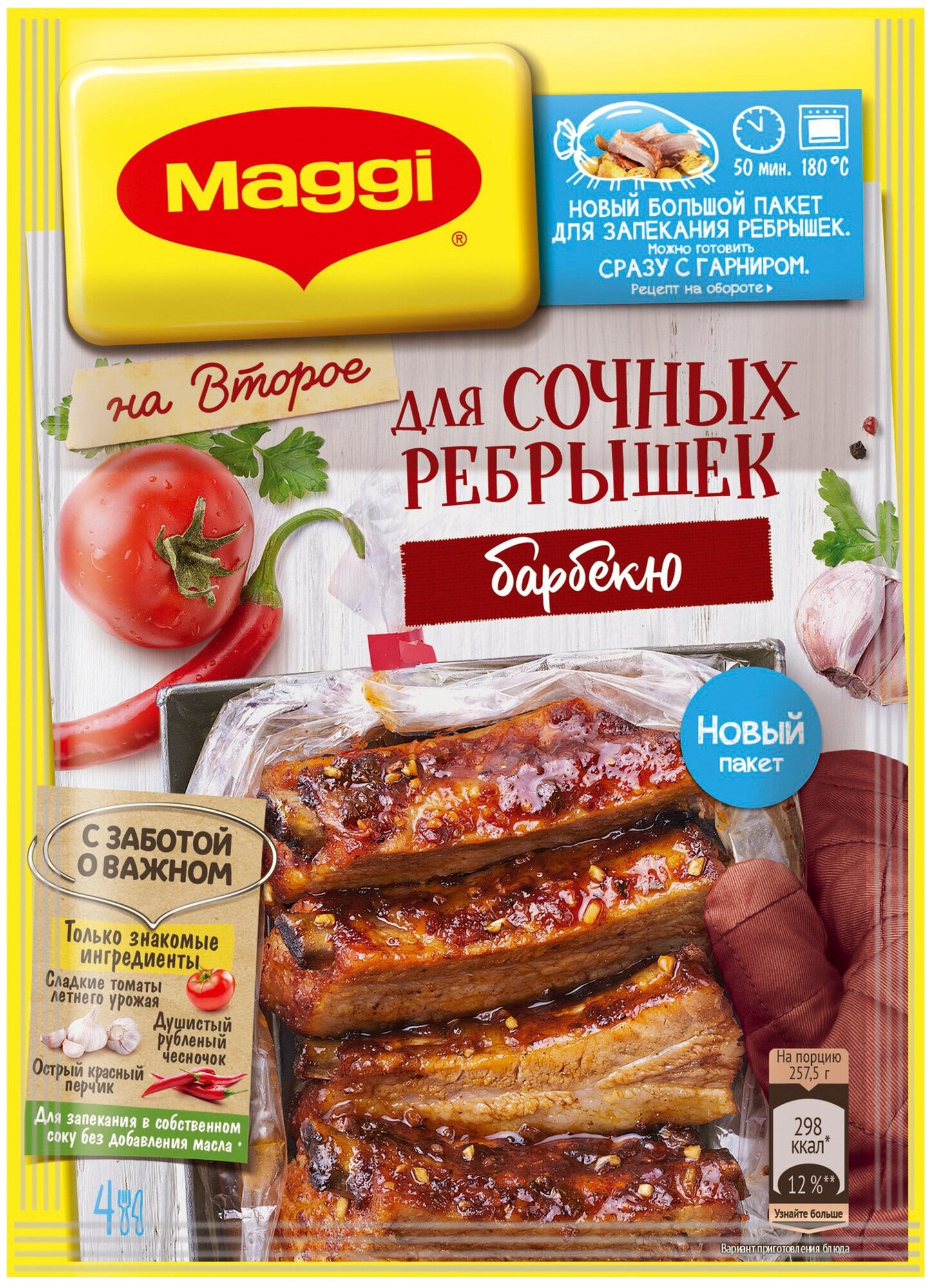 MAGGI На второе для Сочных Ребрышек Барбекю поможет легко и быстро приготовить любимое блюдо для всей семьи! Запеченные в специальном пакете без дополнительного добавления масла ребрышки получаются необычайно сочными и вкусными, а умело-подобранная композиция из овощей, душистых трав и пряных специй поможет раскрыть вкус и аромат вашего блюда. В новом большом пакете для запекания вы можете готовить любимые сочные ребрышки сразу с гарниром - свежими овощами по сезону или крупами, и каждый раз за 50 минут создавать сбалансированное и вкусное блюдо.