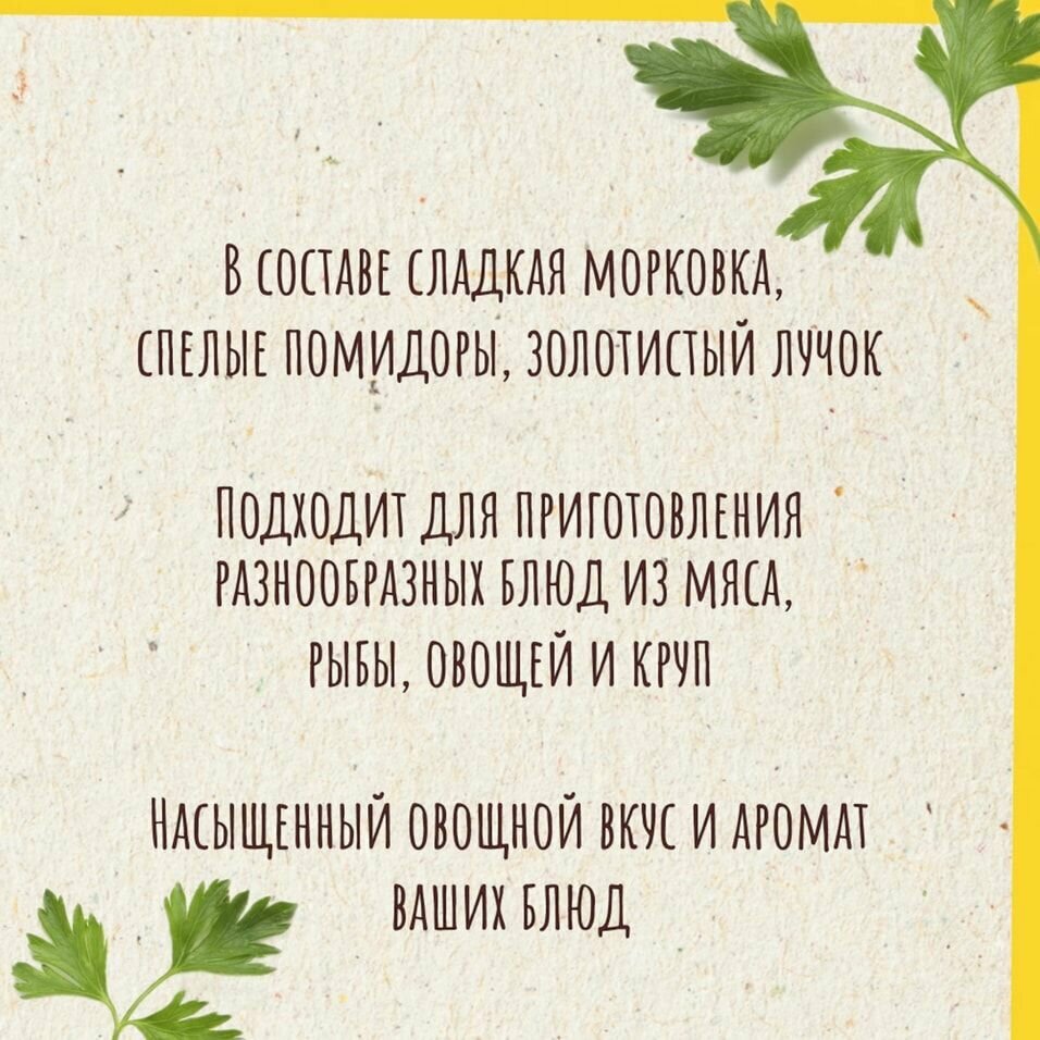 В состав приправы входят все знакомые, понятные ингредиенты: кусочки натуральных овощей, зелень и специи. Сладкая морковка, спелые помидоры, золотистый лучок улучшат вкус любого блюда. Пакетик оборудован удобным zip-замком, чтобы сохранить аромат и свежесть специй, а также защитить приправу от рассыпания.