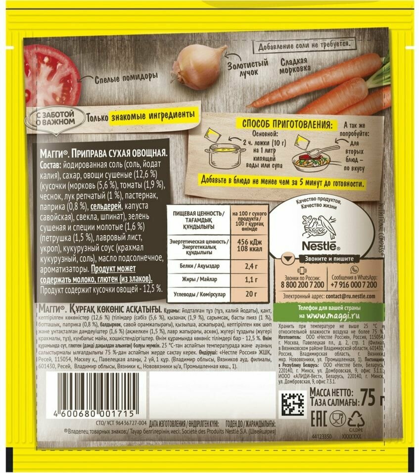 | Состав | Йодированная соль, овощи (морковь, томаты, лук (репчатый и порей), паприка, петрушка, сельдерей, чеснок, пастернак, укроп, капуста савойская), усилители вкуса и аромата (глутамат, гуанилат и инозинат натрия), сахар, подсолнечное масло, ароматизаторы (укроп, вареные овощи), мальтодекстрин, экстракт чеснока, специи и пряности (куркума, лавровый лист), кукурузный крахмал, краситель (медные комплексы хлорофилла, сахарный колер), свекольный сок (порошок).Продукт может содержать незначительное количество молока, глютена. |