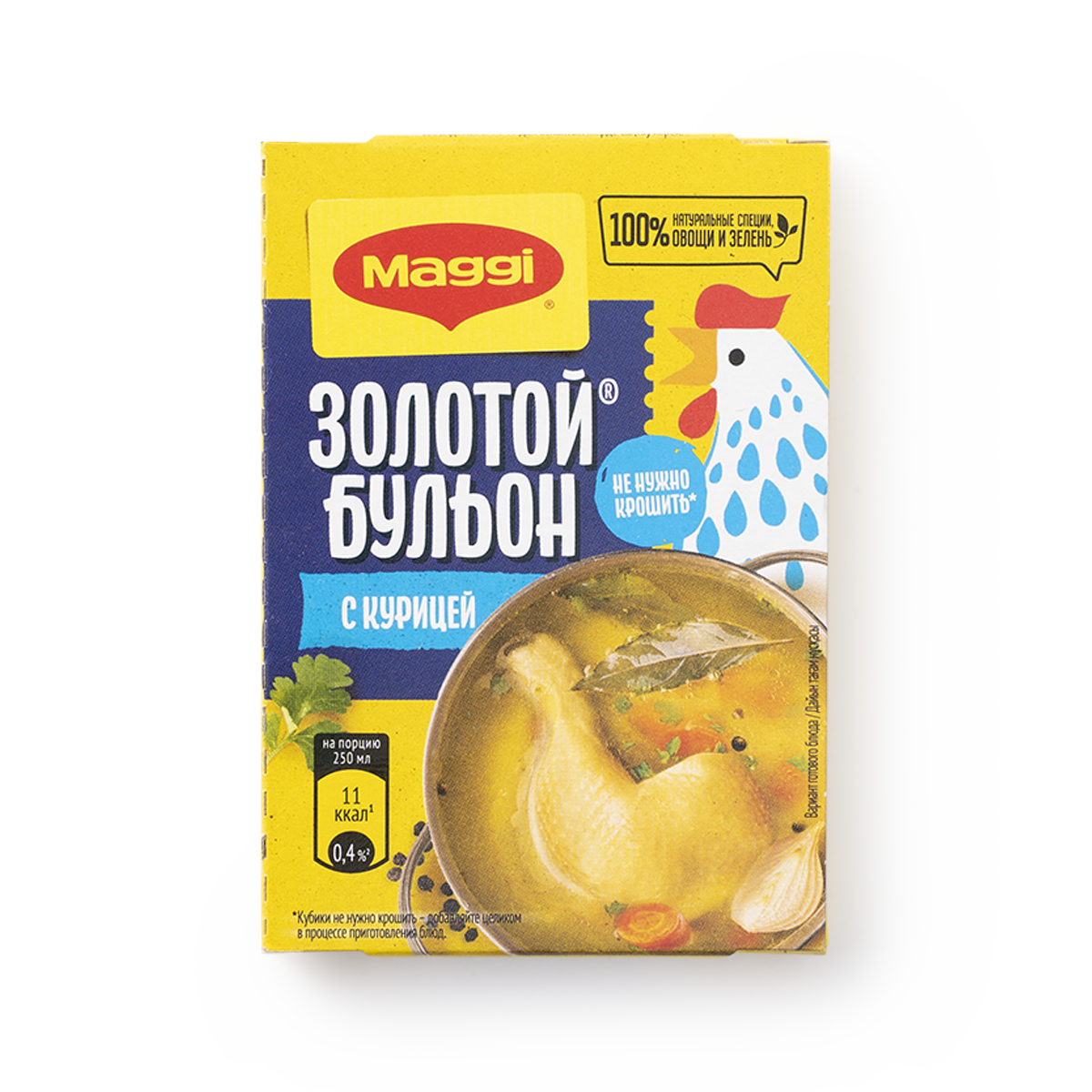 В каждом бульонном кубике идеально сбалансированы куриный и овощной вкусы, соль и тщательно подобранный букет пряностей и специй. Благодаря кубику ваши блюда приобретают вкус и аромат настоящего домашнего куриного бульона, а также аппетитный золотистый цвет.