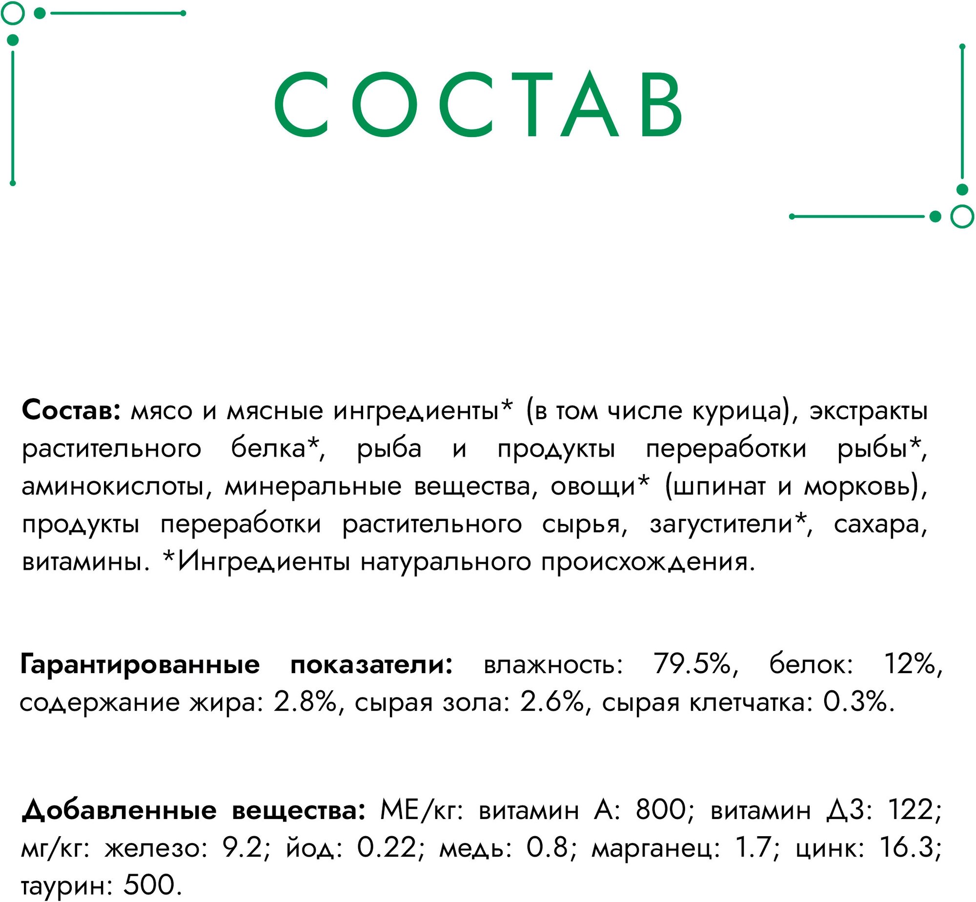 Курица на пару с морковью: мясо и мясные ингредиенты* (в том числе курица), экстракты растительного белка*, рыба и продукты переработки рыбы*, аминокислоты, минеральные вещества, овощи* (шпинат и морковь), продукты переработки растительного сырья, загустители*, сахара, витамины. *Ингредиенты натурального происхождения.