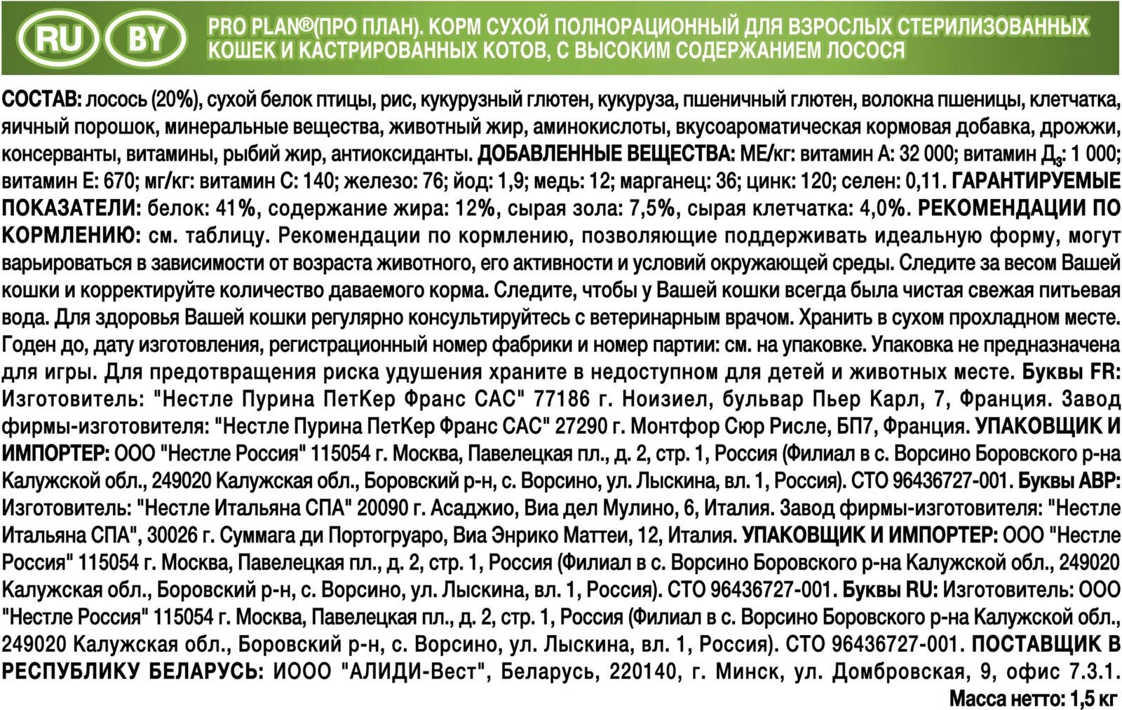 Сухой корм ProPlan Sterilised для стерилизованных и кастрированных кошек лосось 15кг Purina ProPlan (12171884)