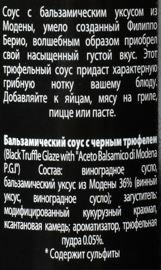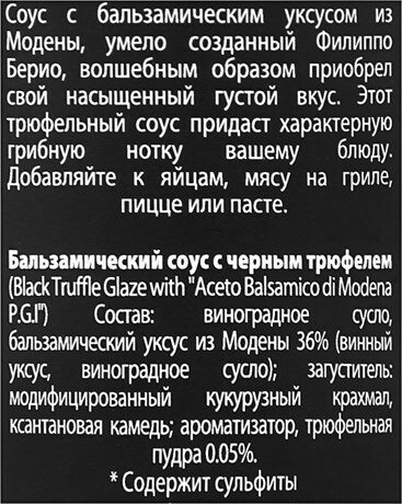 | Состав | Бальзамический уксус из Модены 60% винный уксус (вино*), концентрированное виноградное сусло, краситель сахарный колер E150d, концентрированный виноградный сок, модифицированный кукурузный крахмал, трюфель (1%), загуститель ксантановая камедь, антиокислитель: диоксид серы, ароматизатор. *Содержит сульфиты. |