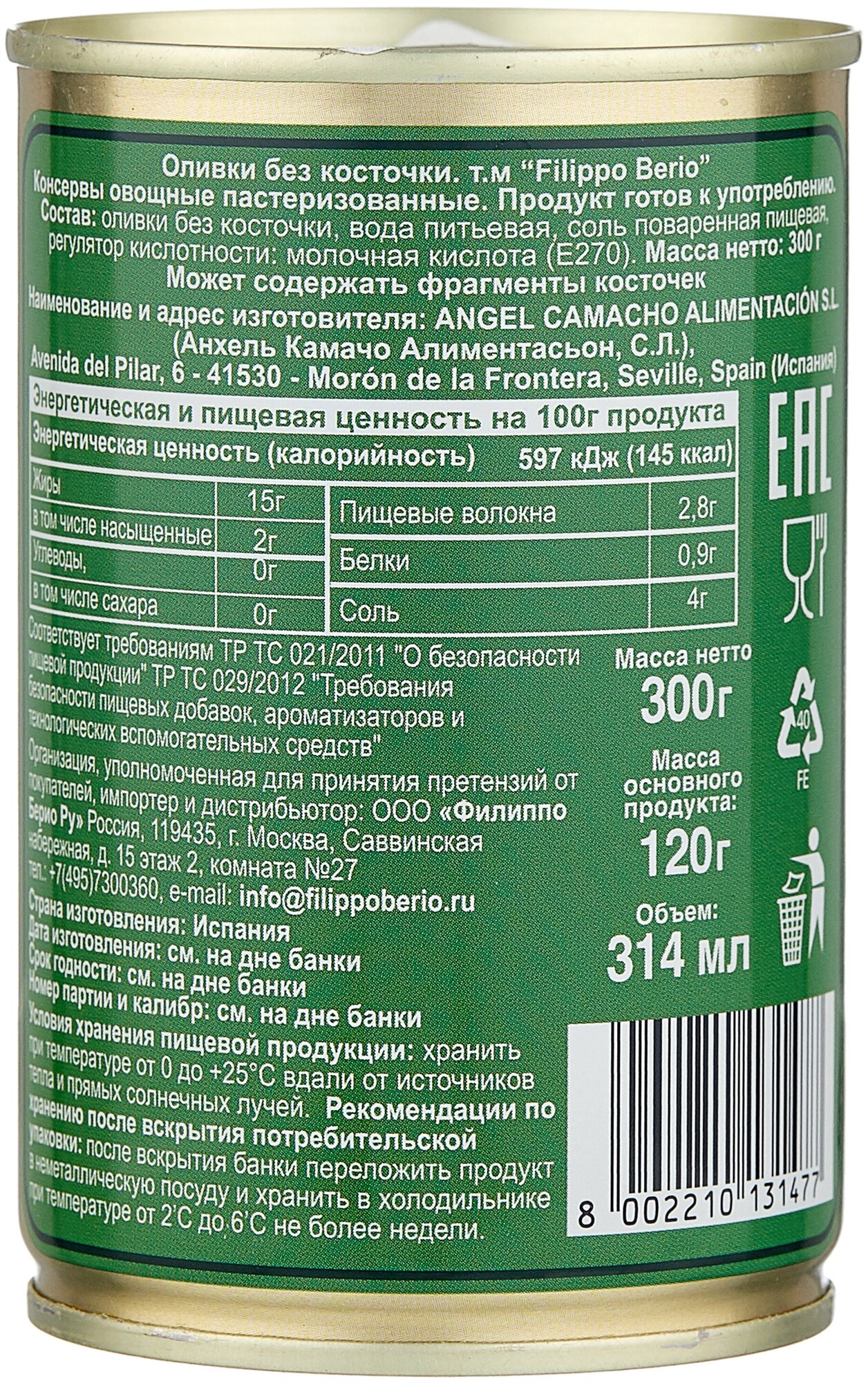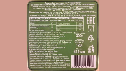 | Состав | вода питьевая, оливки без косточки, соль поваренная пищевая, регулятор кислотности |
