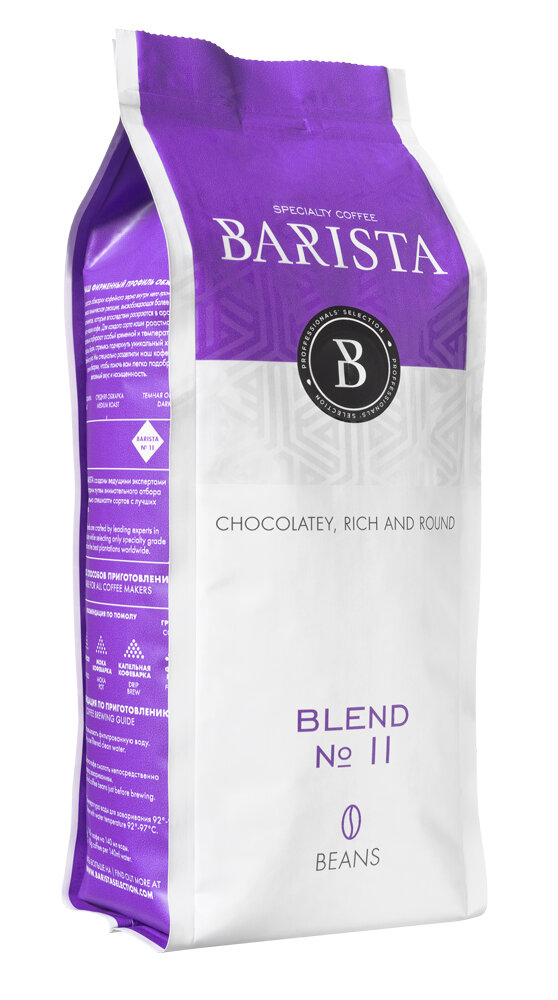 BARISTA Blend № 11 (Зерно) BARISTA Blend № 11 создан из кофейных зерен сорта спешиалти – кофе самого высокого качества. Он составляет всего 10 % мирового урожая и обладает выдающимися ароматические и вкусовыми характеристиками. Это темная обжарка — бленд из двух сортов южноамериканского и южноазиатского кофе мастерски обжарен для выявления богатого и интенсивного вкуса. Он демонстрирует точность и умение роастмастеров, создавших кофе немного темнее остальных блендов, в котором полнота вкуса подчеркнута яркой остротой черного шоколада. Отличный кофе с глубоким вкусом, он станет идеальной основой для любого кофейного напитка с молоком. Описание вкуса:шоколадный, богатый И плотный Гармоничное сочетание интенсивности темного шоколада и специй с легкими винными оттенками создает сложный букет с долгим послевкусием.