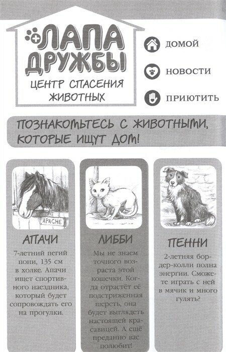 Замечательная история о любви к животным, собираем всю серию, очень поучительная и интересная. Рассказывает о центре помощи животным и помогает привить к ним любовь и хорошее отношение. Помогает сыну полюбить чтение, сам теперь читает с удовольствием) Оформлена красиво, шрифт очень крупный, читать удобно, также есть очень милые черно-белые иллюстрации.