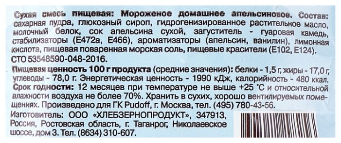 Готовая смесь для приготовления домашнего мороженого «С. Пудовъ» - простой способ побаловать близких лакомством, которое мы все с детства так любим.Всего одного пакета смеси хватит, чтобы приготовить мороженое на всю семью.Это удобно и выгодно. А кроме этого, смесь для приготовления не занимает много места - свежее мороженое можно приготовить в любую минуту.Домашнее апельсиновое мороженое на основе готовой смеси «С. Пудовъ» - настоящий цитрусовый взрыв вкуса.Оно заряжает энергией, отлично утоляет жажду, радует ароматом спелых и сочных плодов. Отличный десерт, перед которым никто не устоит.Дарите радость детства близким так часто, как вы этого захотите. И себя можно побаловать!Состав: сахарная пудра, глюкозный сироп, гидрогенизированное растительное масло, молочный белок, сок апельсина сухой, пищевая морская соль, загуститель гуаровая камедь, стабилизаторы (эфиры глицерина и лимонной и жирных кислот, карбоксиметилцеллюлоза), ароматизаторы (апельсин, ванилин), регулятор кислотности лимонная кислота, пищевые красители (тартразин, понсо 4R).Может содержать следы глютена, сои, яиц, орехов, арахиса, кунжута, сельдерея, горчицы.Пищевая ценность 100 г продукта: белки-4,5 г, жиры-17,0 г, углеводы-70,0 г.Энергетическая ценность-1880 кДж, калорийность - 450 ккал.Срок годности: 12 месяцев, при температуре не выше +25С и относительной влажности воздуха не более 70%.