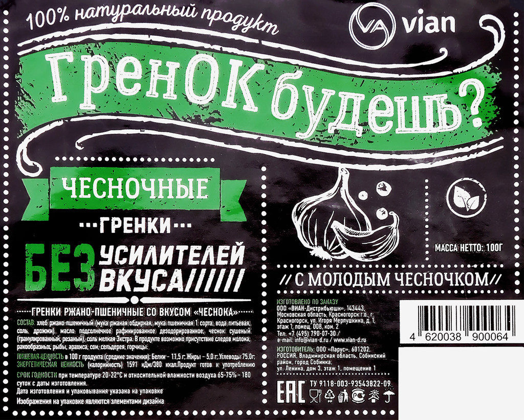 | Состав | Хлеб ржано-пшеничный с солодом, масло подсолнечное рафинированное дезодорированное, чеснок натуральный сушеный (гранулированный, резаный), соль мелкая Экстра |