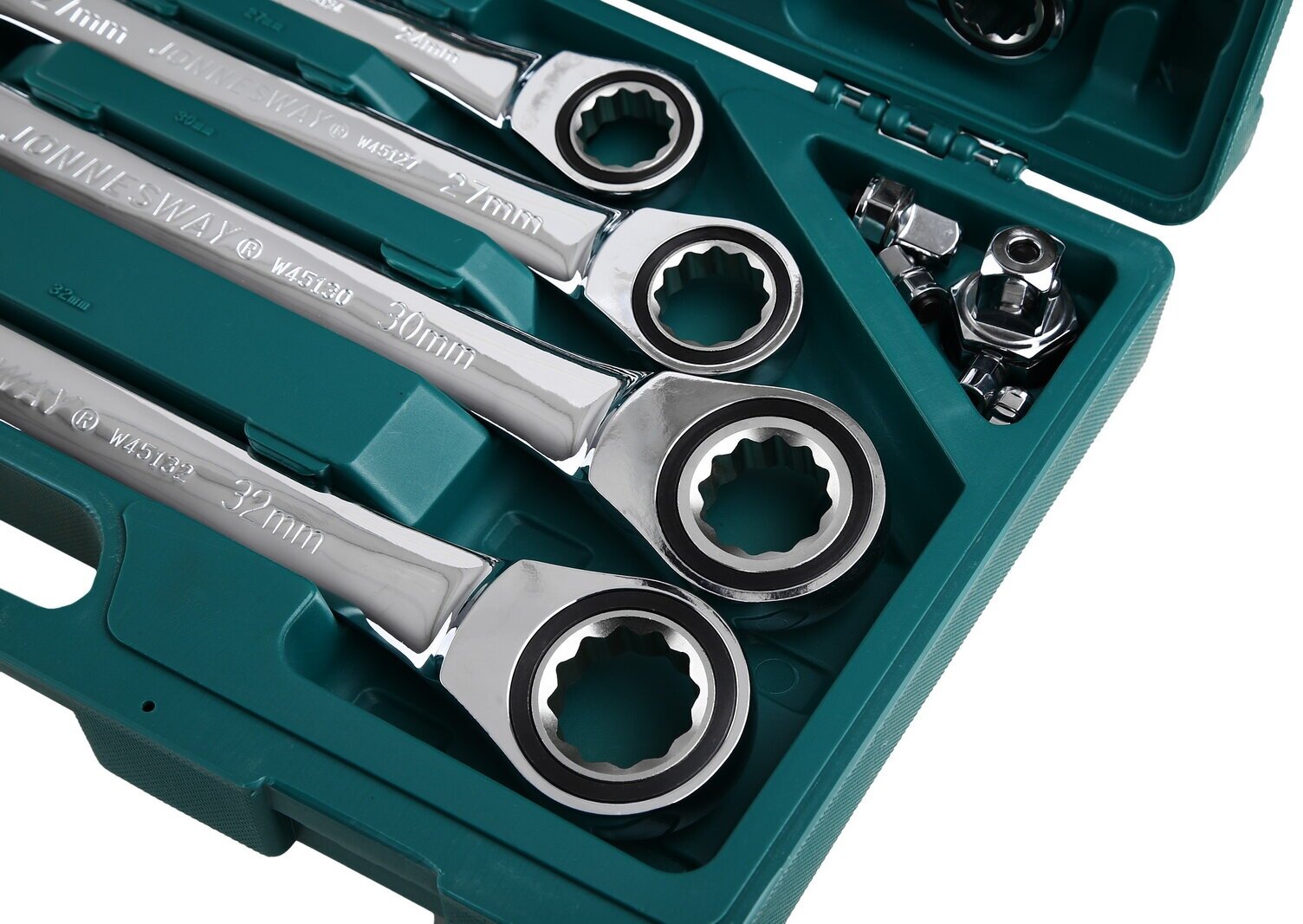 Набор комбинированных трещоточных ключей Jonnesway предназначен для монтажа либо демонтажа резьбовых соединений.Преимущества Высокое качество изготовления. Ключи изготовлены из прочной хромованадиевой стали, что обеспечивает долгий срок службы и устойчивость к коррозии Эргономичный дизайн. Ключи имеют удобную форму и размер, что позволяет легко работать даже в труднодоступных местах Храповой механизм с 72 зубьями. Это обеспечивает плавный и лёгкий ход ключа, что облегчает работу с резьбовыми соединениями Разнообразие размеров. В наборе представлены ключи разных размеров — от 8 до 32 мм, что делает его универсальным инструментом для работы с различными крепежами