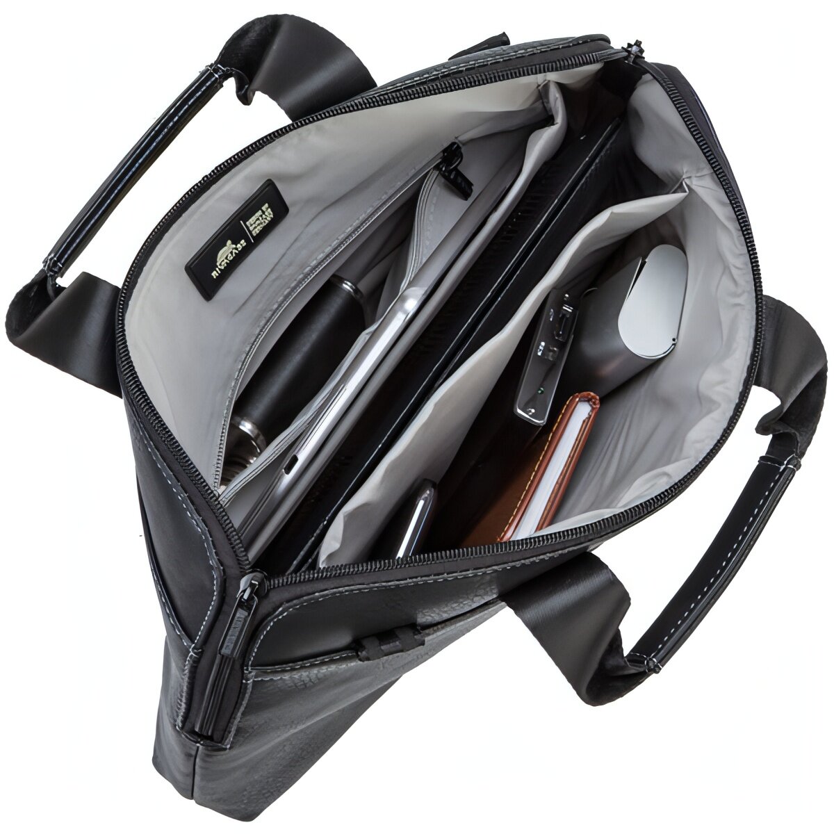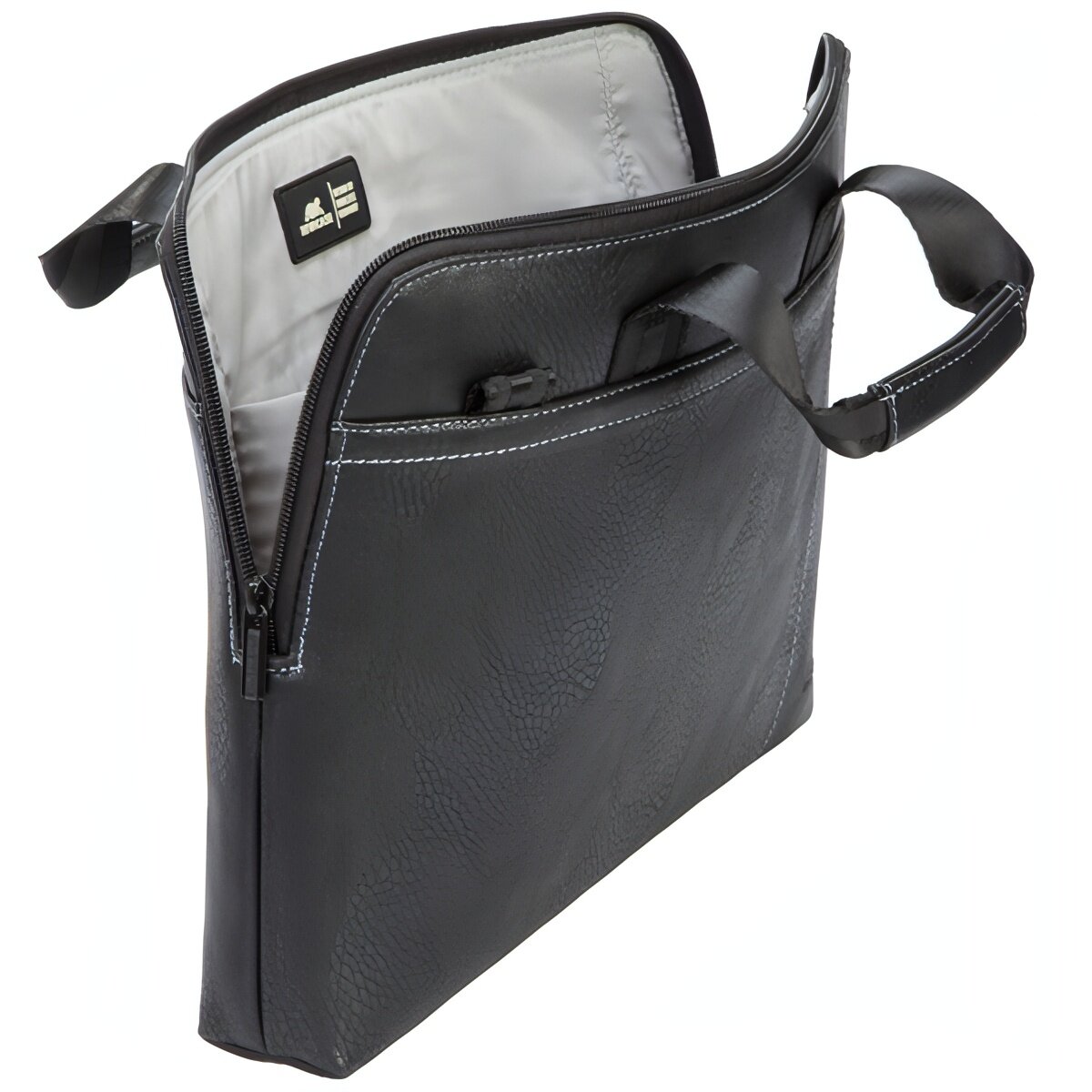 Стильная сумка для ноутбука Riva выполнена из прочной водоотталкивающей ткани. Он защищает девайс от пыли, влаги и царапин, даже если гаджет упал с небольшой высоты. Чехол подходит для всех моделей лэптопов диагональю до 15,6 дюйма.