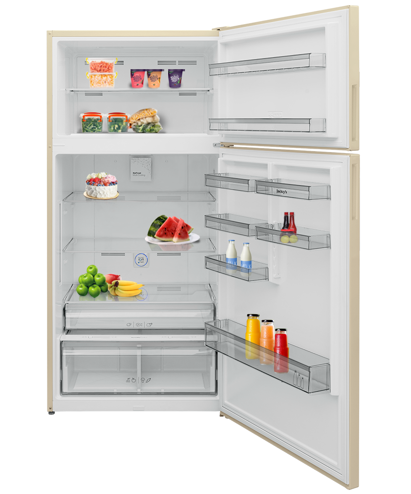 Холодильник Jacky's - двухкамерная модель с верхним расположением морозильной камеры, общим объёмом 625 литра, выполненная в мраморном бежевом цвете. Стильная модель с верхней морозильной камерой, гарантирующая вашим продуктам свежесть и отличный вкус на протяжении всего срока хранения!Великолепные технологические решения обеспечивают наилучшую сохранность продуктов:Электронный дисплей Обеспечивает простое и интуитивно-понятное управление.Natural Ion Tech Данная технология ионизации увеличивает срок хранения овощей и фруктов в 2 раза! Благодаря данной технологии внутри камеры холодильника распространяются отрицательные ионы, которые нейтрализуют частицы неприятного запаха и бактерии до 99,9%.Humidity Control Специальные воздушные каналы и особый фильтр позволяют регулировать уровень влажности отделения для овощей с максимальной точностью, обеспечивая свежесть продуктов, расположенных внутри. Дополнительным преимуществом является наличие специальных направляющих, благодаря которым отделение для овощей выдвигается плавно, а продукты не перемешиваются и не сминаются.Зона свежести Зона свежести гарантирует, что пища внутри отделения остается свежей до 2-х раз дольше при идеальной температуре около 0 ºC. Разместите внутри замороженное мясо или рыбу для размораживания перед употреблением и убедитесь в отсутствии неприятного запаха и замечательного качества продуктов!Регулируемая по высоте дверная полка V Lift Может устанавливаться на 6 разных высотах для комфортного размещения емкостей и бутылок разной высоты. Специальный механизм обеспечивает быстрое изменение высоты полки без ее извлечения;Хромированная окантовка полочек Подчеркивает изысканность деталей и позволяет разместить модель в интерьере любой современной кухниNo frost Multi Cooling Технология No frost Multi cooling включает в себя две независимые циркуляции воздуха с двумя отдельными вентиляторами и испарителями, обеспечивая дополнительную свежесть с оптимальным уровнем влажности в каждом отделении. Использование данной технологии предотвращает смешивание запахов и сохраняет натуральный вкус продуктов.