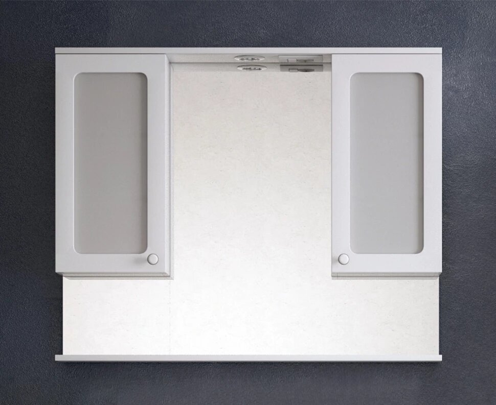 | Дополнительная информация | Зеркало-шкаф оснащено 2 закрытыми дверцами с фрезеровкой и матовыми стёклами позади. Петли с доводчиками. Верхняя часть оборудована подсветкой. Позади дверей вкладные полки. Эмаль - глянцевая белая. |