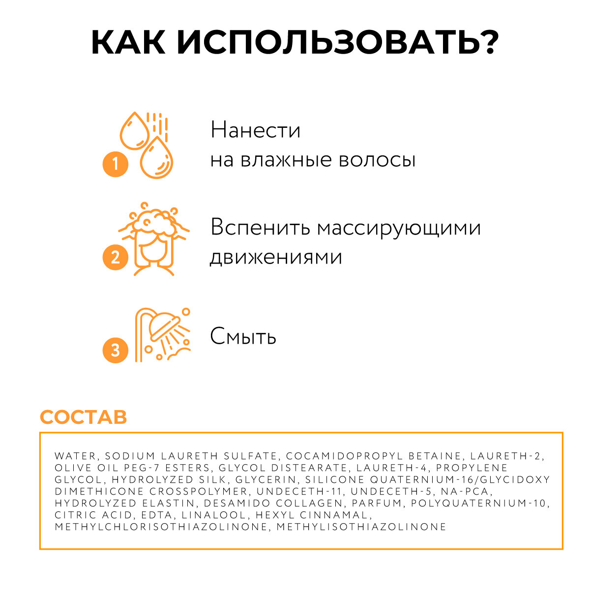 | Способ применения | Нанести на влажные волосы, вспенить массирующими движениями. Смыть водой. |