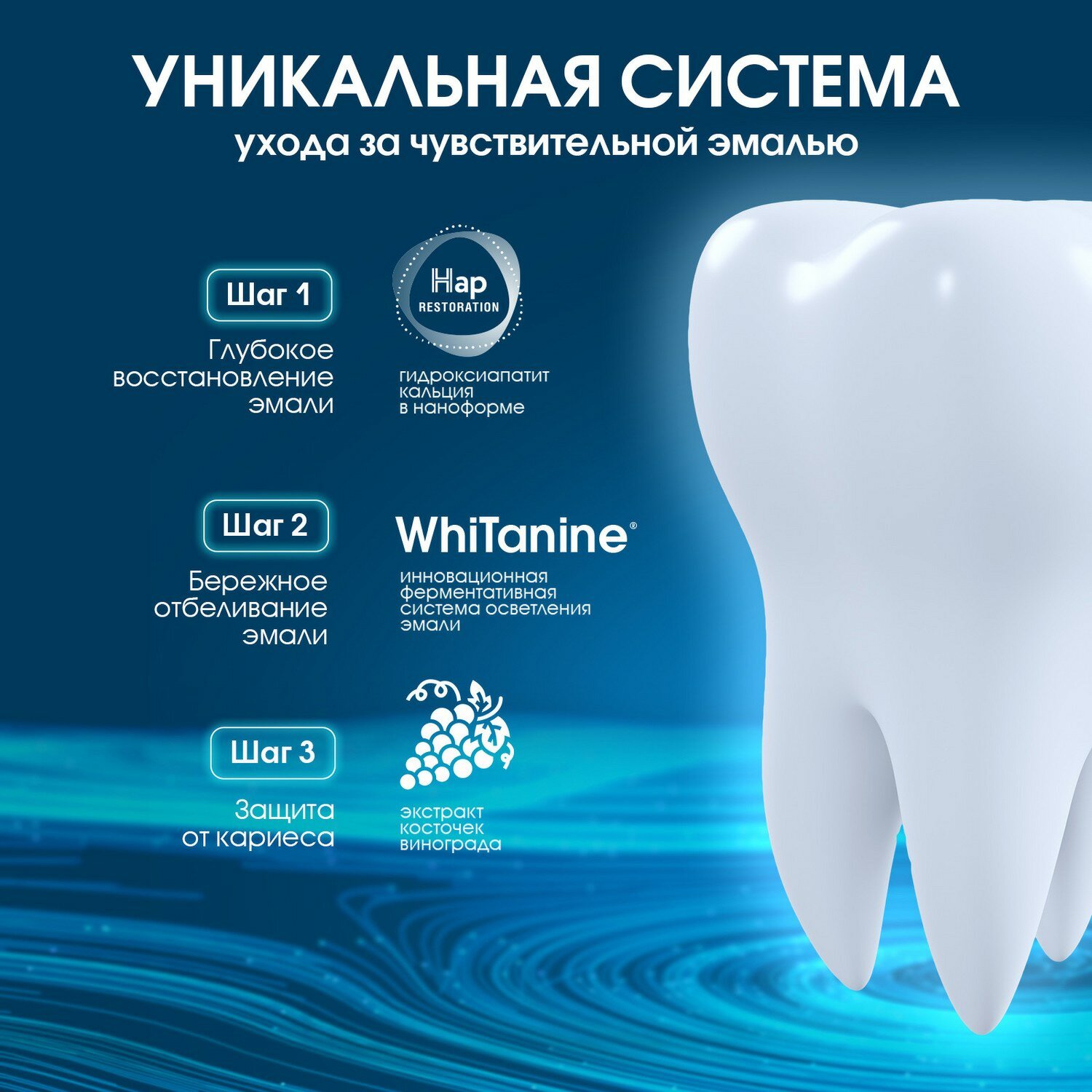 | Химический состав | Aqua, Hydrogenated Starch Hydrolysate, PEG-40 Hydrogenated Castor Oil, Calcium/Magnesium/Zinc Hydroxyapatite (nano), Calcium Lactate, Xanthan Gum, PEG-8, Aroma, Vitis Vinifera Seed Extract, Lonicera Caprifolium Flower Extract, Lonicera Japonica Flower Extract, Disodium EDTA, Tocopheryl Acetate, Anethole, Eucalyptol, Sucralose, Thymol, Tannase, Citric Acid, Sodium Benzoate, Potassium Sorbate, Limonene. |