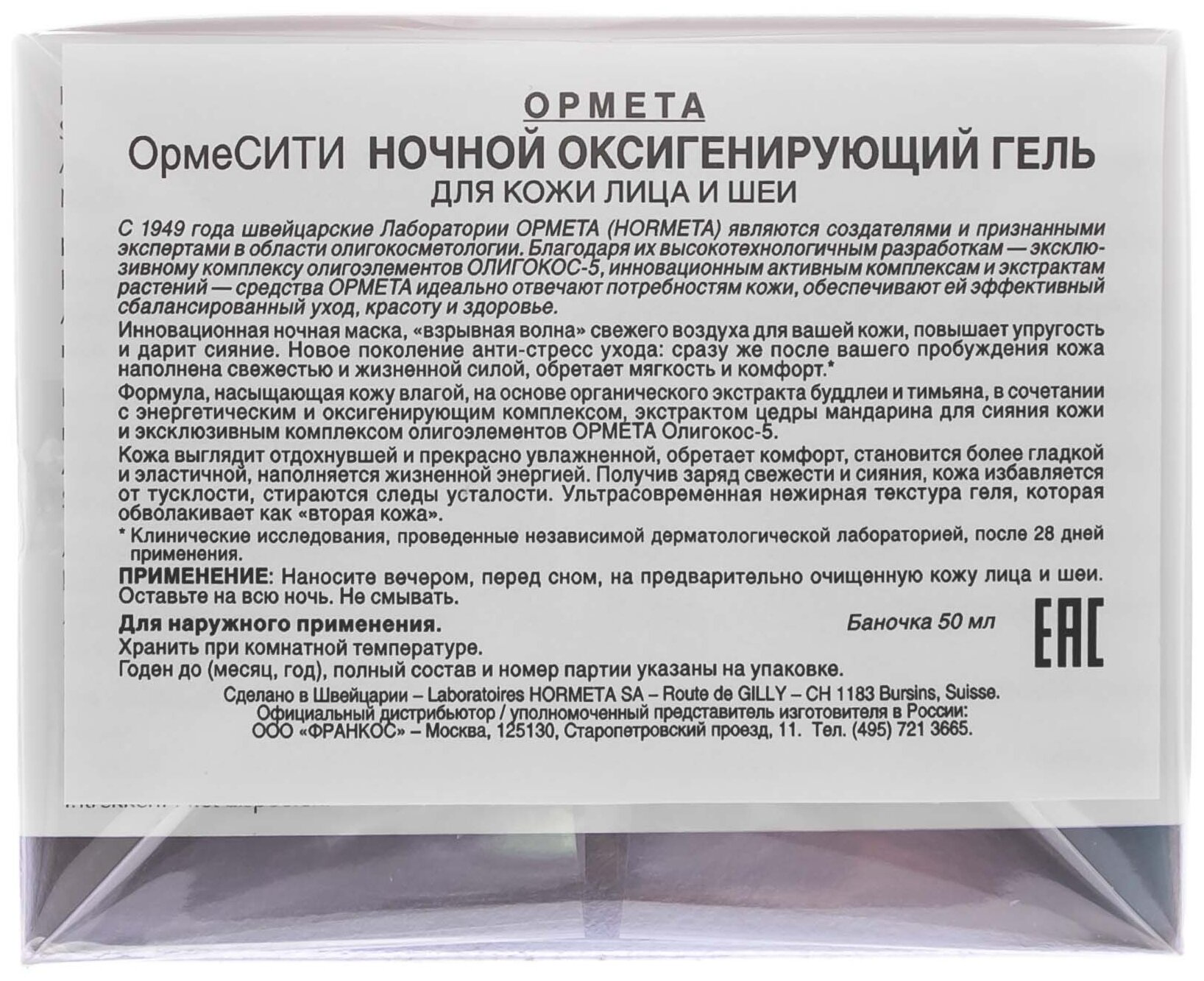 ОрмеСИТИ Ночной оксигенирующий гель оказывает выраженное антиоксидантное, антирадикальное и защитное действие. Улучшает клеточное дыхание и восстанавливает эпидермальный матрикс. Устраняет следы усталости и восстанавливает упругость и эластичность кожи. Борется с окислительным стрессом и восстанавливает естественное сияние кожи лица