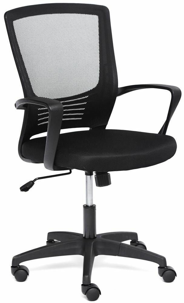 Функциональное кресло черного цвета из коллекции OFFICE станет отличным решением для любого рабочего кабинета и гармонично впишется в обстановку дома или офиса. Каркас модели изготовлен из крепкого пластика и фанеры. Такие материалы отличаются повышенной прочностью и надежностью. Мягкое сиденье с наполнителем из пенополиуретана стандартной плотности, обитое прочной тканью, не деформируется со временем, не требует сложной чистки. Фиксированные пластиковые подлокотники, механизм регулировки высоты и наклона с фиксацией в одном положении позволят принять удобную позу и снять напряжение с позвоночника. Полиамидная крестовина кресла толщиной 600 мм устойчива, надежна и имеет долгий срок службы. Удобная сетчатая спинка кресла позволяет свободно циркулировать воздуху, создавая владельцу комфортные условия труда. Высококачественные ролики помогут плавно передвигаться по офису или дому, подходят для использования на низковорсовых ковровых покрытиях и на специальных защитных поверхностях. Кресло добавит в помещение благородство, уют и комфорт. Максимальная нагрузка модели 120 кг. Кресло поставляется в разобранном виде, требуется несложная сборка по прилагаемой инструкции. Дополнительный складной луч крестовины обеспечивает компактность упаковки.Кресла компьютерные - эргономичные офисные кресла, созданные специально для комфорта и поддержки при длительном сидении за компьютером. Они оснащены колесиками, что позволяет легко перемещаться вокруг рабочего пространства, не вставая из кресла. Офисные кресла на колесиках имеют регулируемую высоту, что позволяет каждому пользователю подобрать оптимальное положение.Категория товара "Кресла компьютерные" включает в себя специально разработанные стулья для использования перед компьютером. Они имеют эргономичную форму, регулируемые спинку и подлокотники, а также комфортное сидение. Использование таких кресел позволяет снизить риск возникновения болей в спине и шее, улучшить осанку и общую работоспособность. Эта категория товара стоит использовать для повышения комфорта и здоровья во время работы или длительных сессий перед компьютером.Tetchair - инновационный бренд мебели, который предлагает комфорт и функциональность в каждом изделии. Наша мебель сочетает современный дизайн, высокое качество материалов и передовые технологии, что делает ее идеальным выбором для современного образа жизни. Отдыхайте и работайте с удовольствием, в полной гармонии с Tetchair.