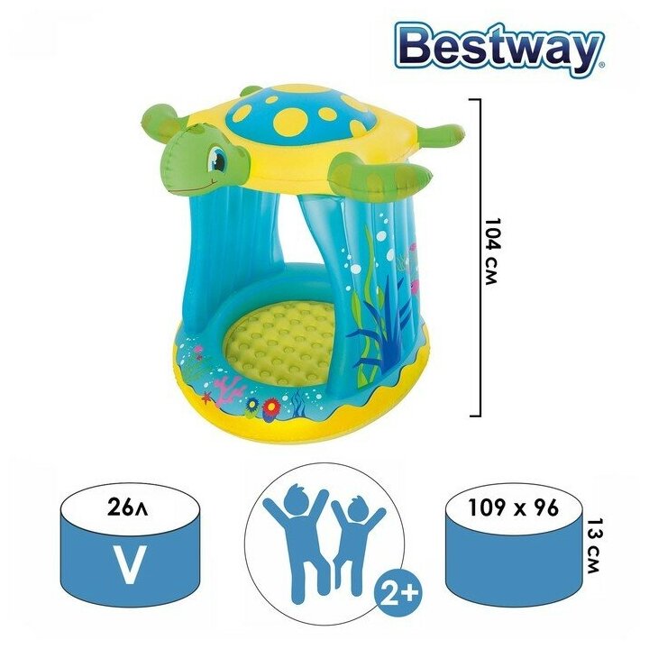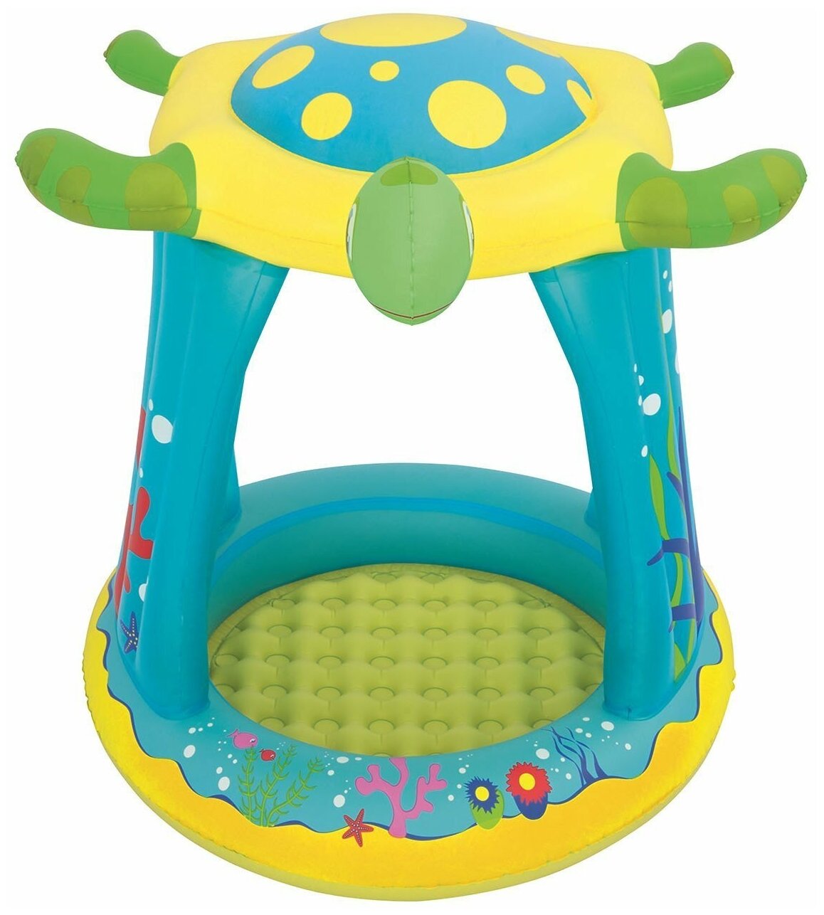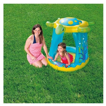 Отличный бассейн. Покупали специально ребенку для поездки на море. (дочери 2.6 года.) Бассейн со своей функцией справился на Ура. Пока родители отдыхали на пляже, ребенок с большим удовольствием плескался под крышей бассейна. (Черепашка отлично защищает от солнца.) Кстати сказать, надувается насосом очень быстро и относительно не долго сдувается. Покупали по скидке. Однозначно рекомендую к покупке.