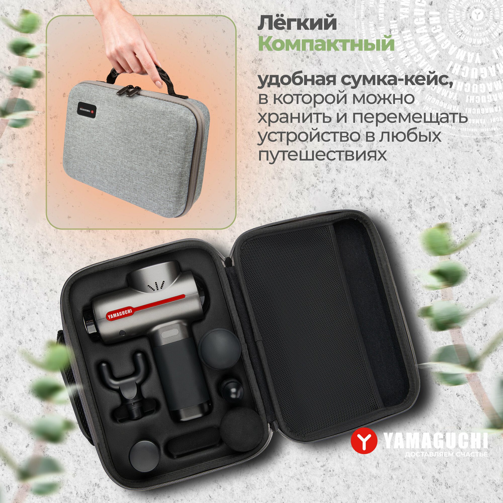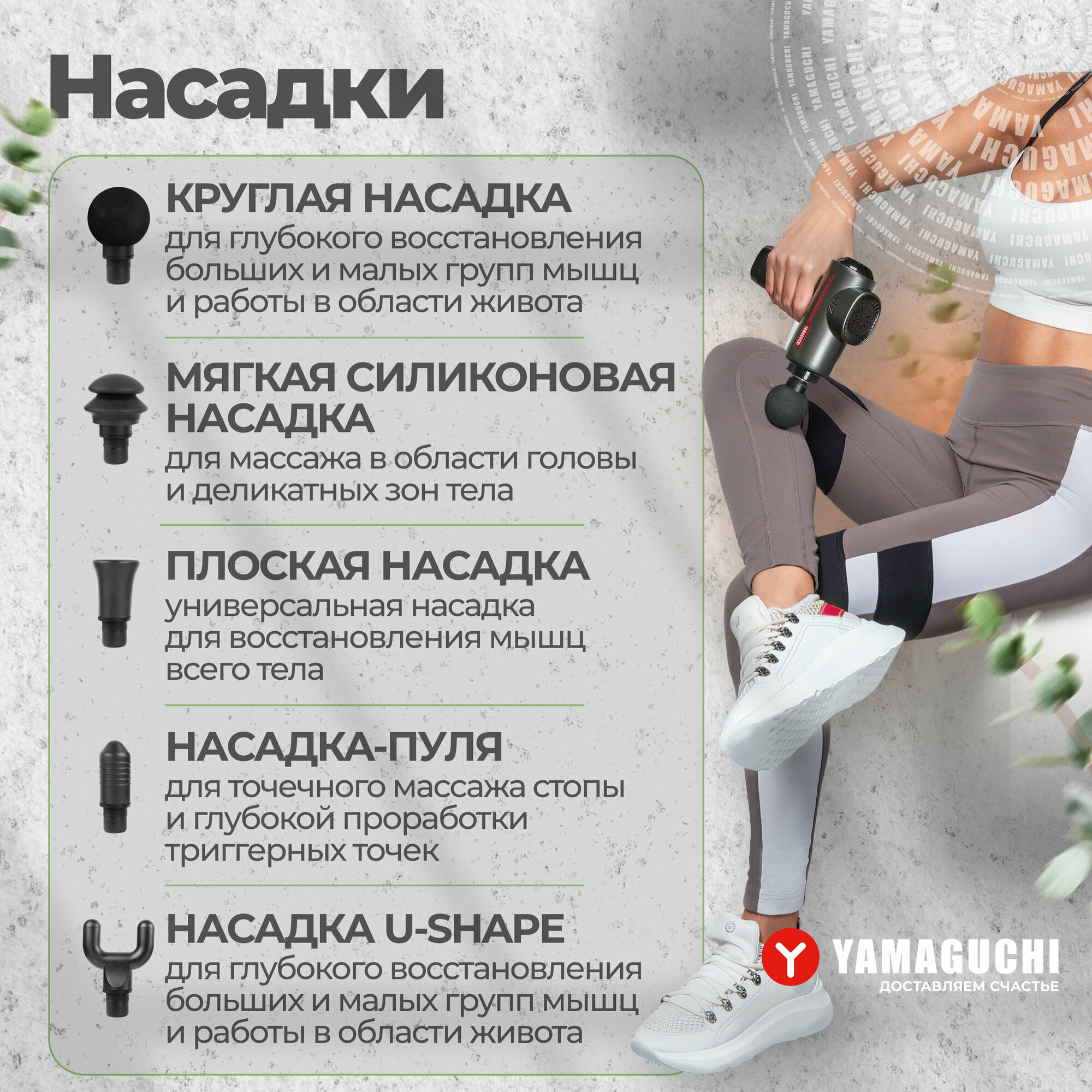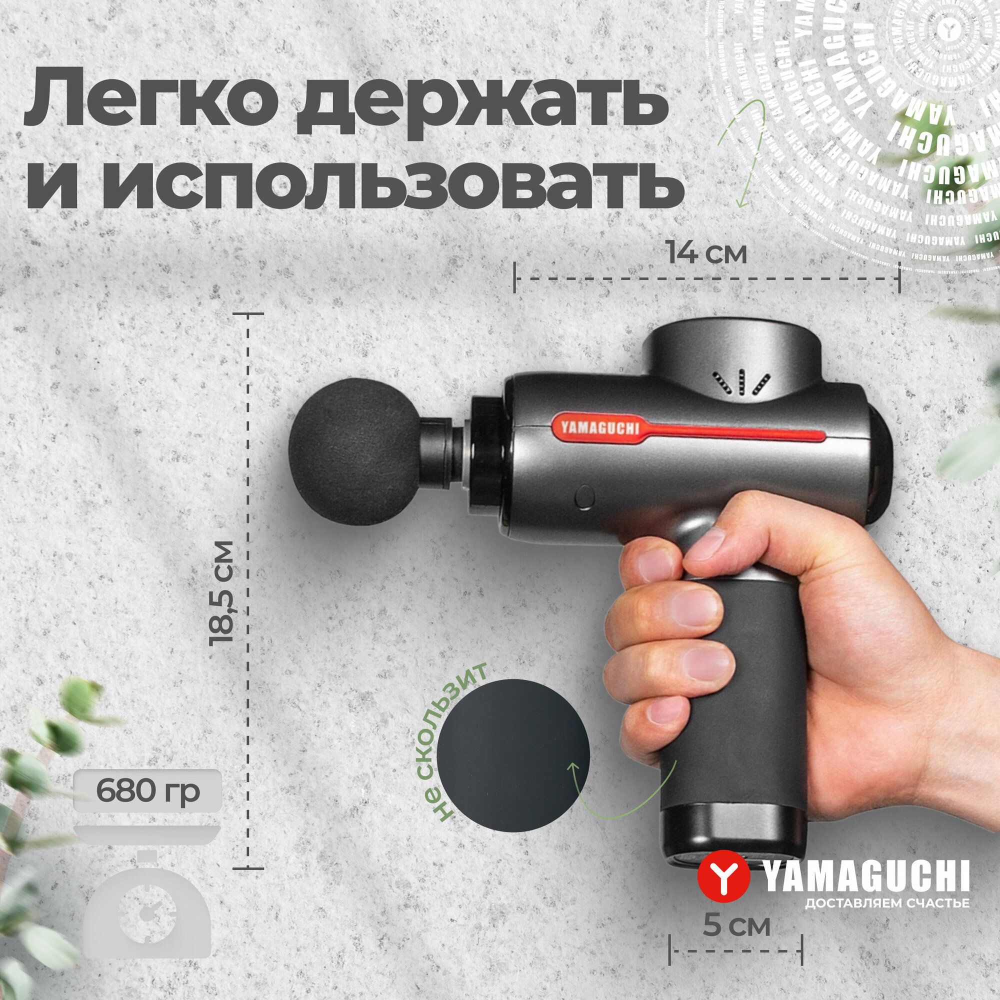Перкуссионный массажер для тела YAMAGUCHI - новый уровень современного восстановления.Перкуссионный массажер для тела Yamaguchi — это инновационный беспроводной инструмент для осуществления глубокого перкуссионного и миофасциального массажа мышц всего тела.Благодаря усиленным направленным вибрирующим пульсациям массажерпомогает стимулировать кровоток, быстро восстанавливать мышцы после тренировок и травм способствует увеличению объема движений и гибкости мышц снимает мышечную боль и расслабляет все тело устраняет миофасциальный синдромпрорабатывает триггерные точки всего тела уменьшает общую мышечную боль и скованность позволяет самостоятельно устранить болевой синдром в домашних условиях восстанавливает мышцы после силовых тренировок, усиливает кровообращениеулучшает общее состояние мягких тканей тела улучшает диапазон движений мышц, ускоряет восстановление, а также снижает риск получения травм (растяжения связок и мышечных сухожилий) в будущем. Уникальные насадки для вибротерапии - 5 шт. Весит всего 680 гр.