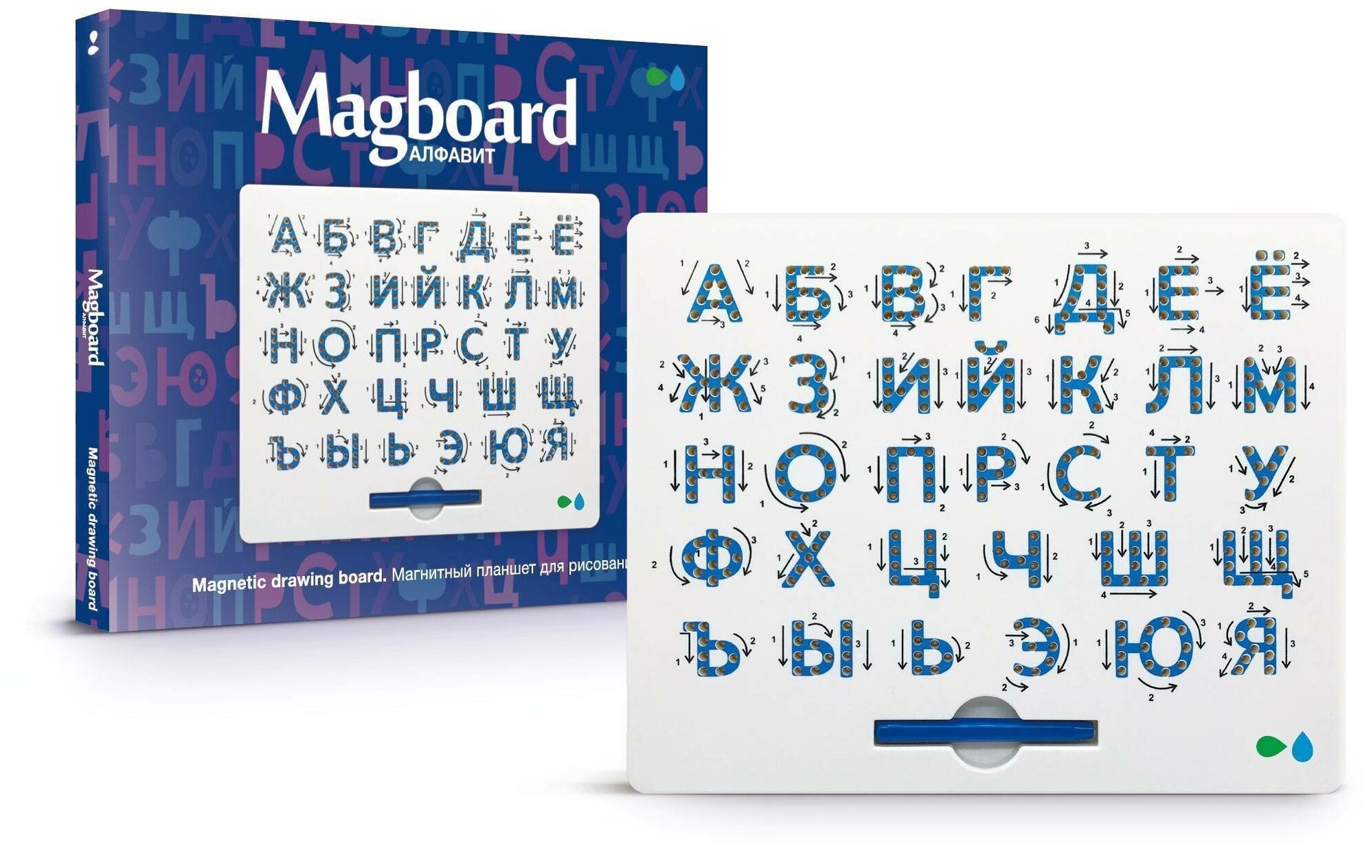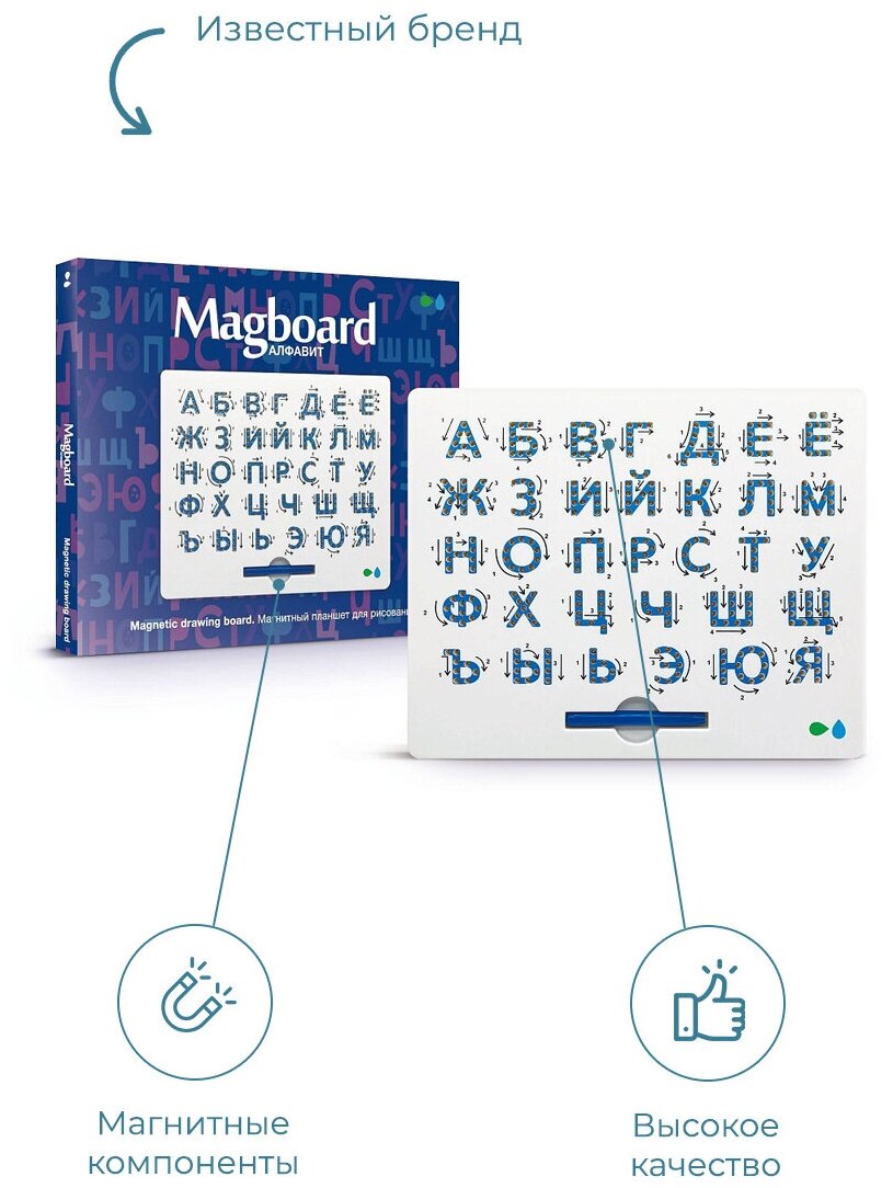 Назад к истокам Магнитный планшет для рисования Magboard Изучать с ребёнком буквы можно по-разному. Одни родители рисуют их на картонках, другие — вырезают из бумаги, третьи — приобретают азбуку или ищут обучающие видео в интернете. Есть и куда более интерактивный вариант, для которого не нужны ни канцелярия, ни доступ к всемирной сети! Рисуйте при помощи магнитного пера! Оно входит в набор Magboard , и с его помощью можно прямо в процессе игры изучать буквы. Достаточно провести пером по поверхности, чтобы металлические шарики, спрятанные внутри, сформировались в знакомые символы. Благодаря стрелкам ребёнок будет понимать, как правильно писать каждую букву. Планшет для рисования магнитами Magboard можно не только использовать для учёбы дома, но и брать с собой на дачу, в гости или в отпуск. В машине и самолёте будет чем занять детей, а время получится потратить с пользой!
