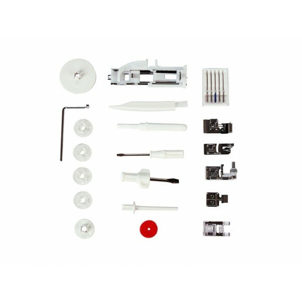 | Комплект поставки | Вспарыватель; Катушкодержатель; Кисточка; Лапка для автоматического выметывания петель; Лапка для вшивания молнии; Лапка для потайной подшивки низа; Лапка оверлочная; Лапка подрубочная; Лапка универсальная; Набор игл; Отвертки большая и малая; Педаль; Фетровая прокладка; Шпули (тестовый набор) |