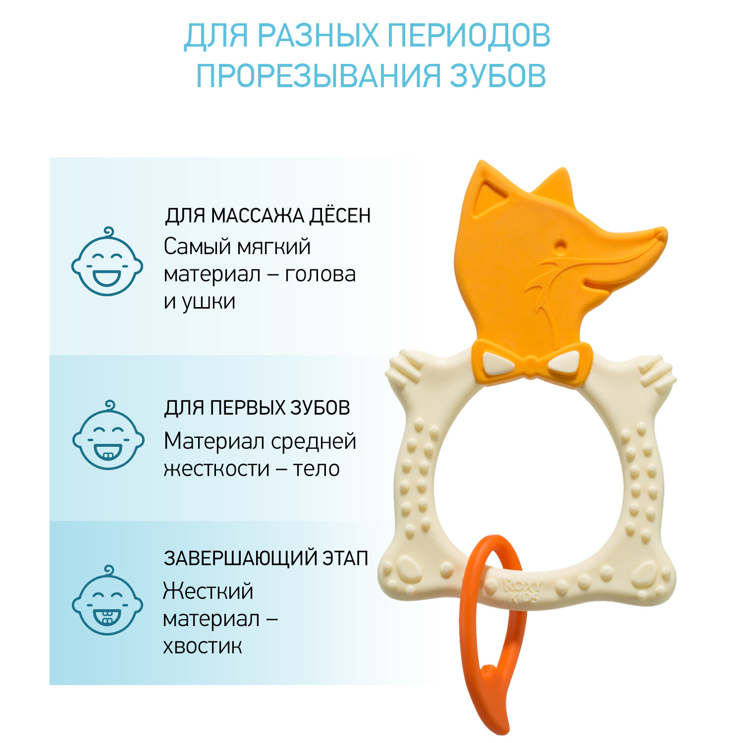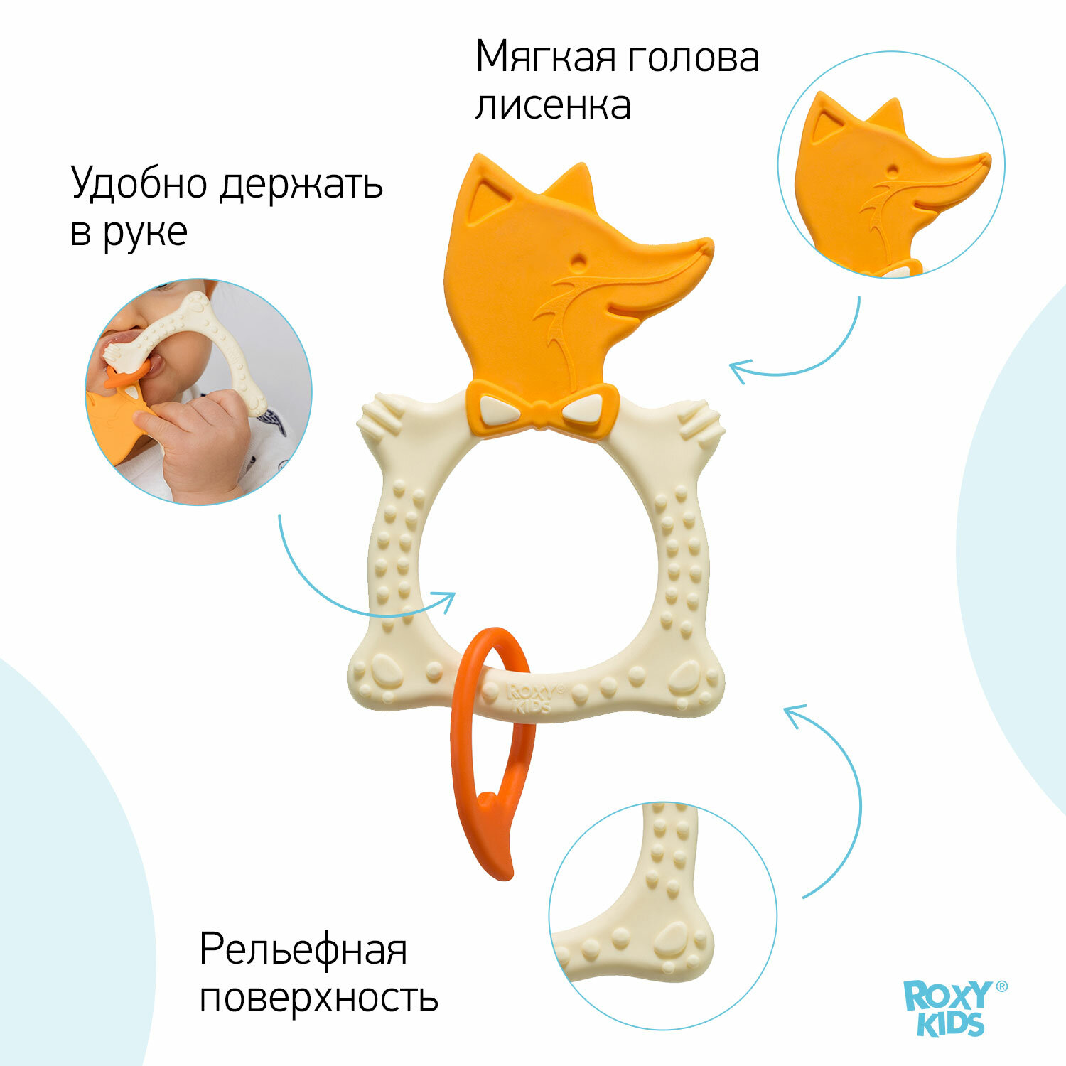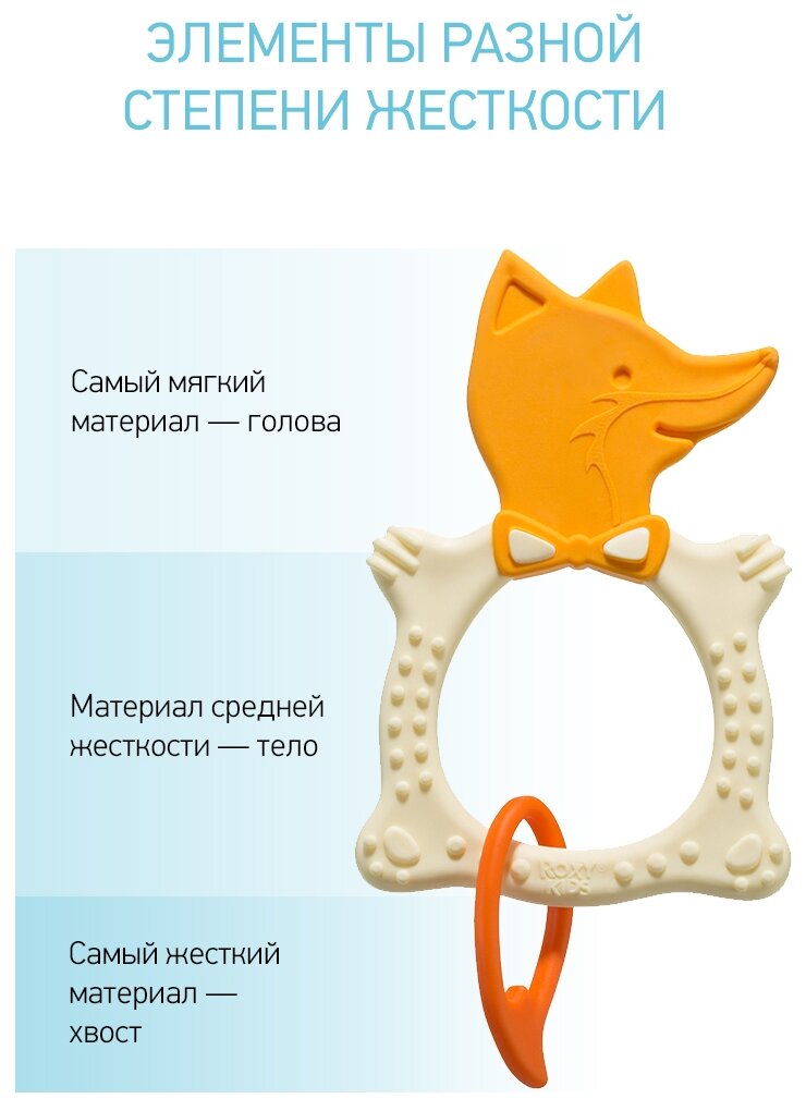 различной степени жесткости. На начальном этапе, когда у малыша раздражены десны, он может чесать их о мягкую рельефную голову лисенка,Потом уже грызть более твердое тело и твердый хвост.