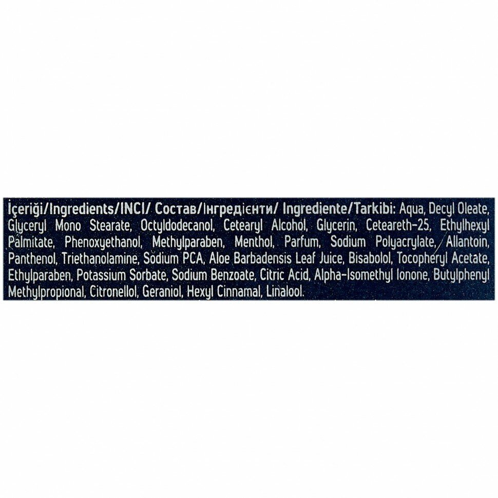 | Состав | Aqua, Decyl Oleate, Glyceryl Stearat, Octyldodecanol,Cetearyl Alcohol,Glicerin,Ceteareth-25, parfum,Ethylhexyl Palmitate, sodium Polyacrylate, Allantoin, Menthyl Lactate, Aloe Barbadensis Leaf Juice, SodiumPCA,Benzoate,trethanolamine, Butylphenyl Methylpropional, Alpha-Isomethyllonone, Citrollol, Geraniol, Hexyl Cinnamal, Hydroxycitronellal, linalool |