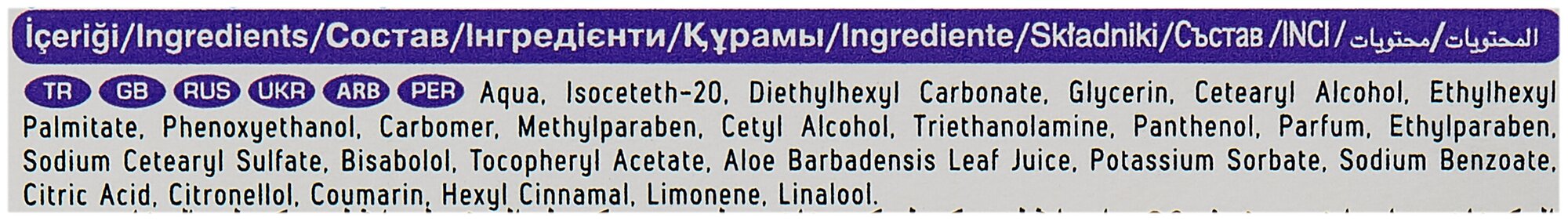 | Химический состав | Aqua, Isoceteth-20, Diethylhexyl Carbonate, Glycerin, Cetearyl alcohol, Ethylhexyl TR GB Palmitate, Phenoxyethanol, Carbomer, Methylparaben, Cetyl Alcohol, Triethanolamine, Panthenol, Parfum, Ethylparaben, Sodium Cetearyl Sulfate, Bisabolol, Tocopheryl Acetate, Aloe Barbadensis Leaf Juice, Potassium Sorbate, Sodium Benzoate, Citric Acid, Citronellol, Coumarin, Hexyl Cinnamal, Limonene, Linalool. |