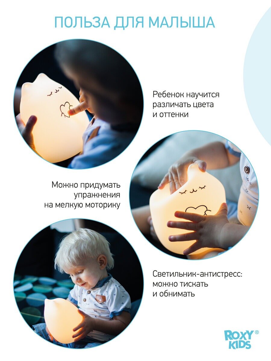- Ночник сделан из гипоаллергенного силикона, что позволяет малышу без опаски мять или даже грызть игрушку;