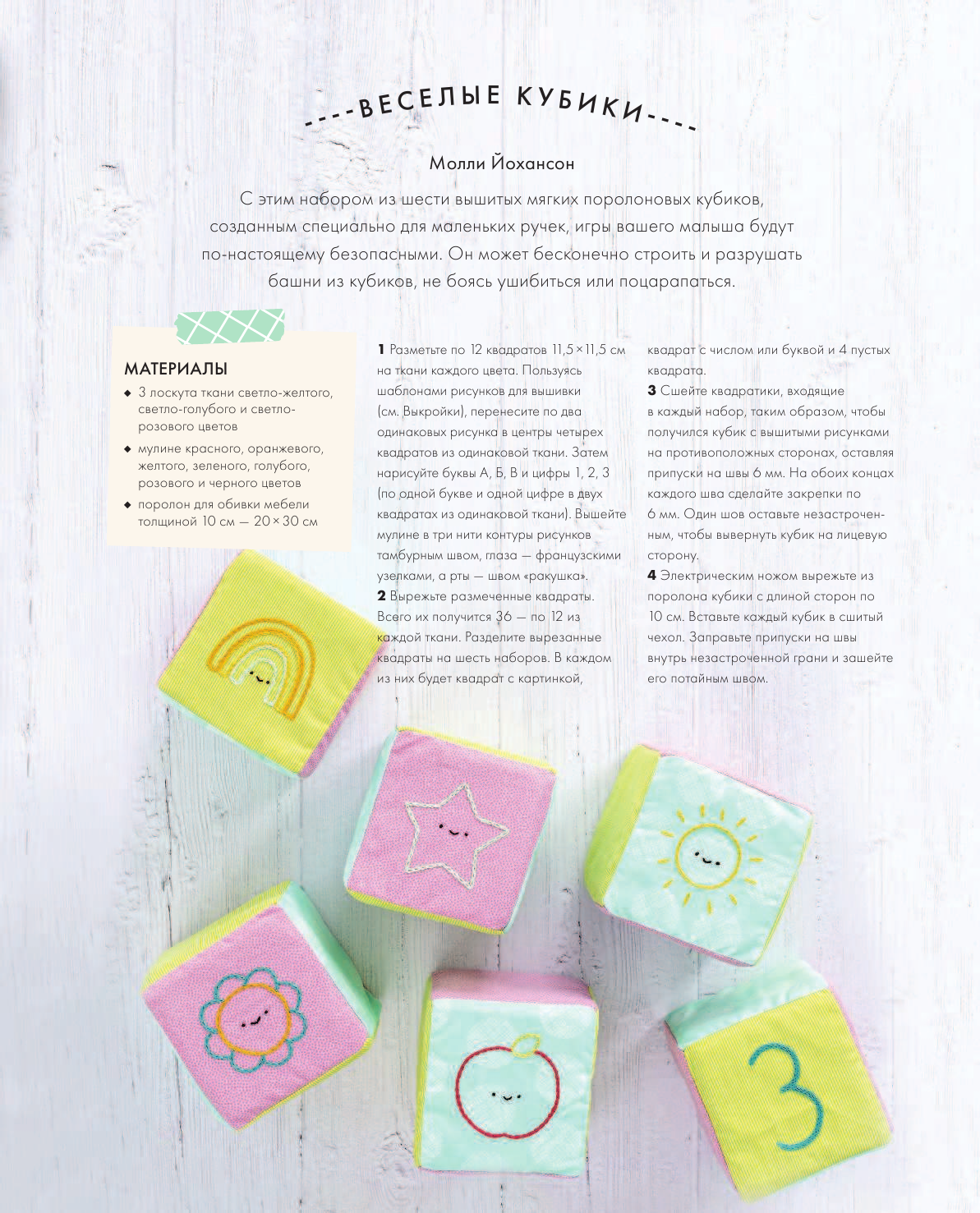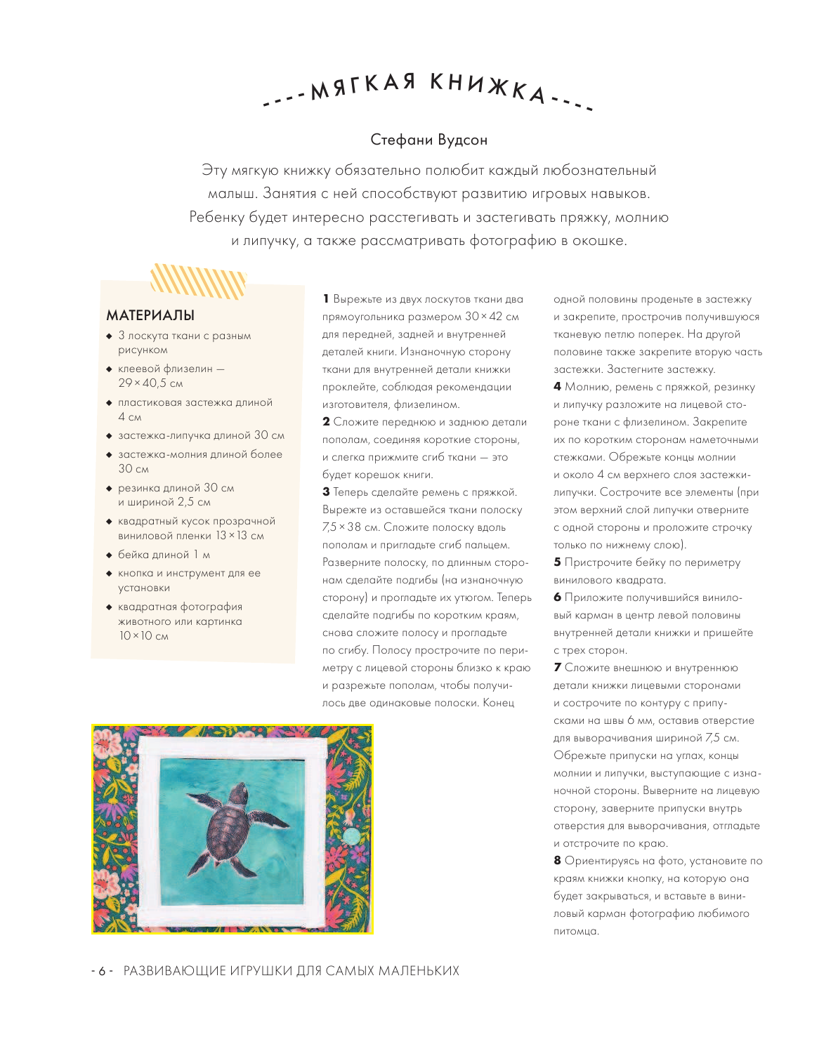 Чтобы сшить таких милых созданий или сделать красивые и полезные игры для малыша, не нужно ни дорогих и редких материалов, ни даже навыков шитья, достаточно хоть немного владеть иголкой и ниткой и найти дома несколько лоскутков подходящей расцветки. Выкройки в натуральную величину, представленные в книге, гарантируют, что игрушка получится именно такой, какую вы задумали.