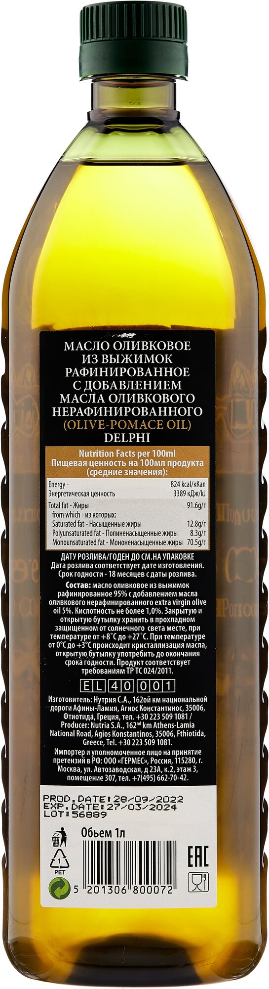 | Состав | масло оливковое из выжимок рафинированное 95% с добавлением масла оливкового нерафинированного extra virgin olive oil 5% |