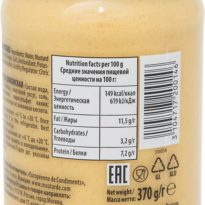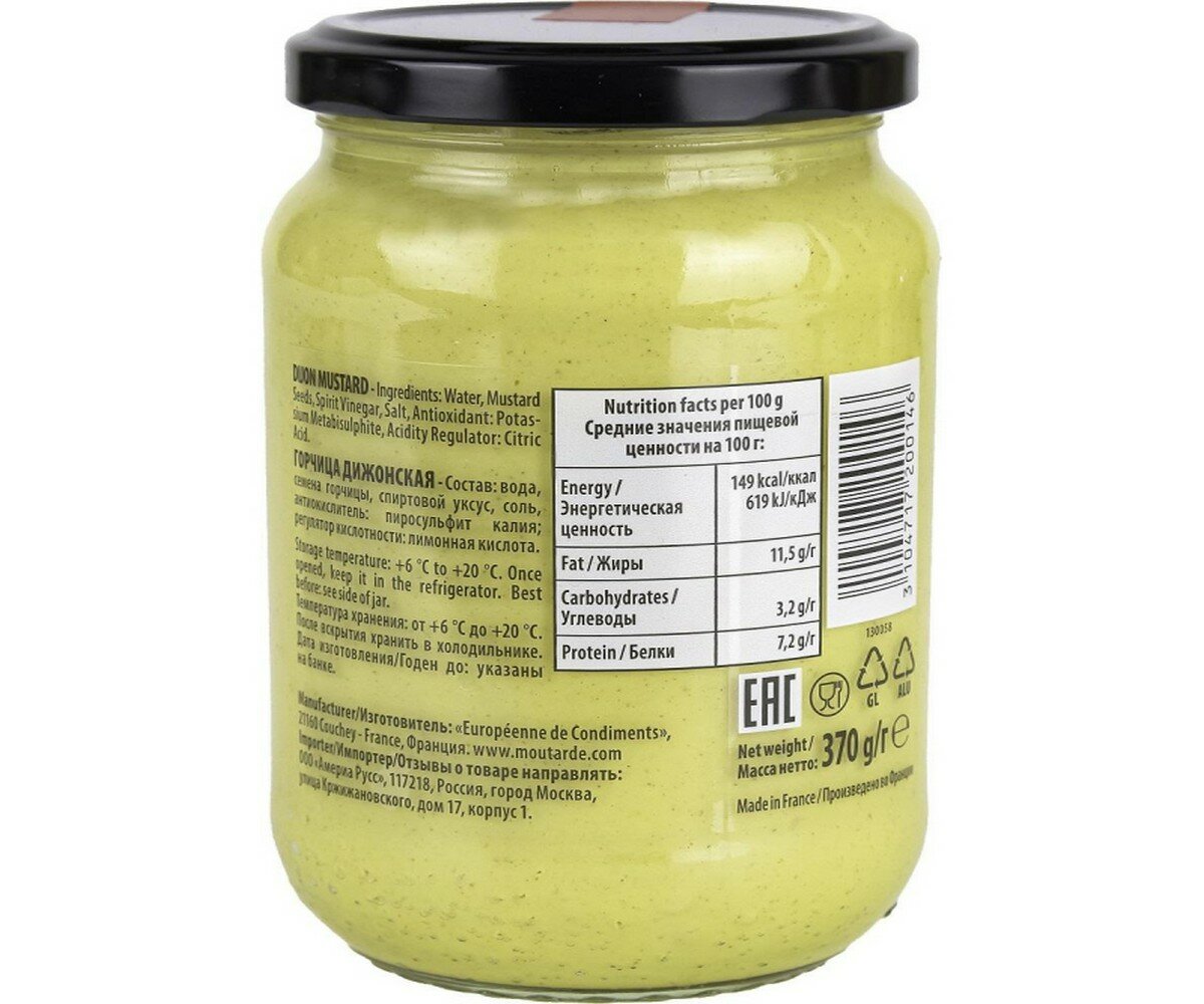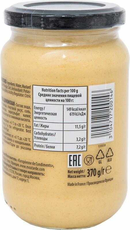 Состав: вода, семена горчицы, спиртовой уксус 18%, соль, антиокислитель; метабисульфит калия, регулятор кислотности: лимонная кислота