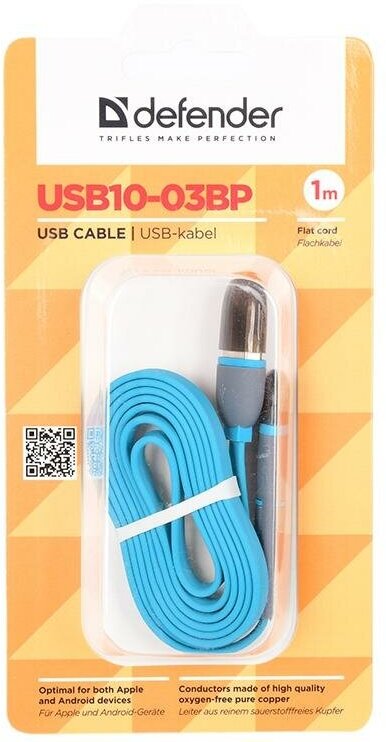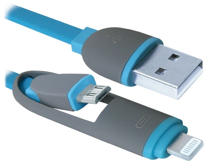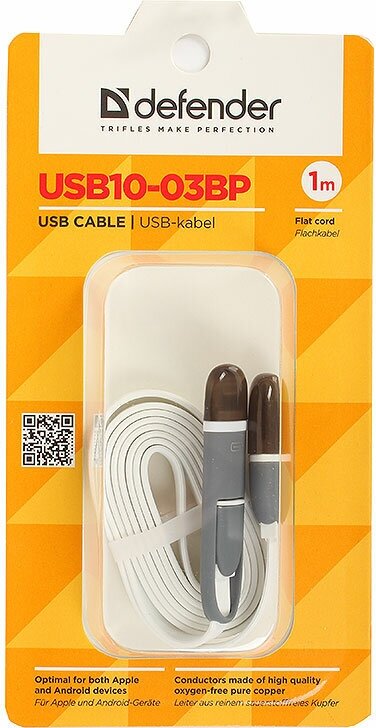 Defender USB10-03BP / 87488 — универсальный кабель с особым коннектором Micro USB и переходником на разъем Lightning, который при использовании с продукцией Apple надевается, а при использовании универсального Micro USB снимается и сдвигается в сторону. Благодаря такой конструкции переходник не потеряется.